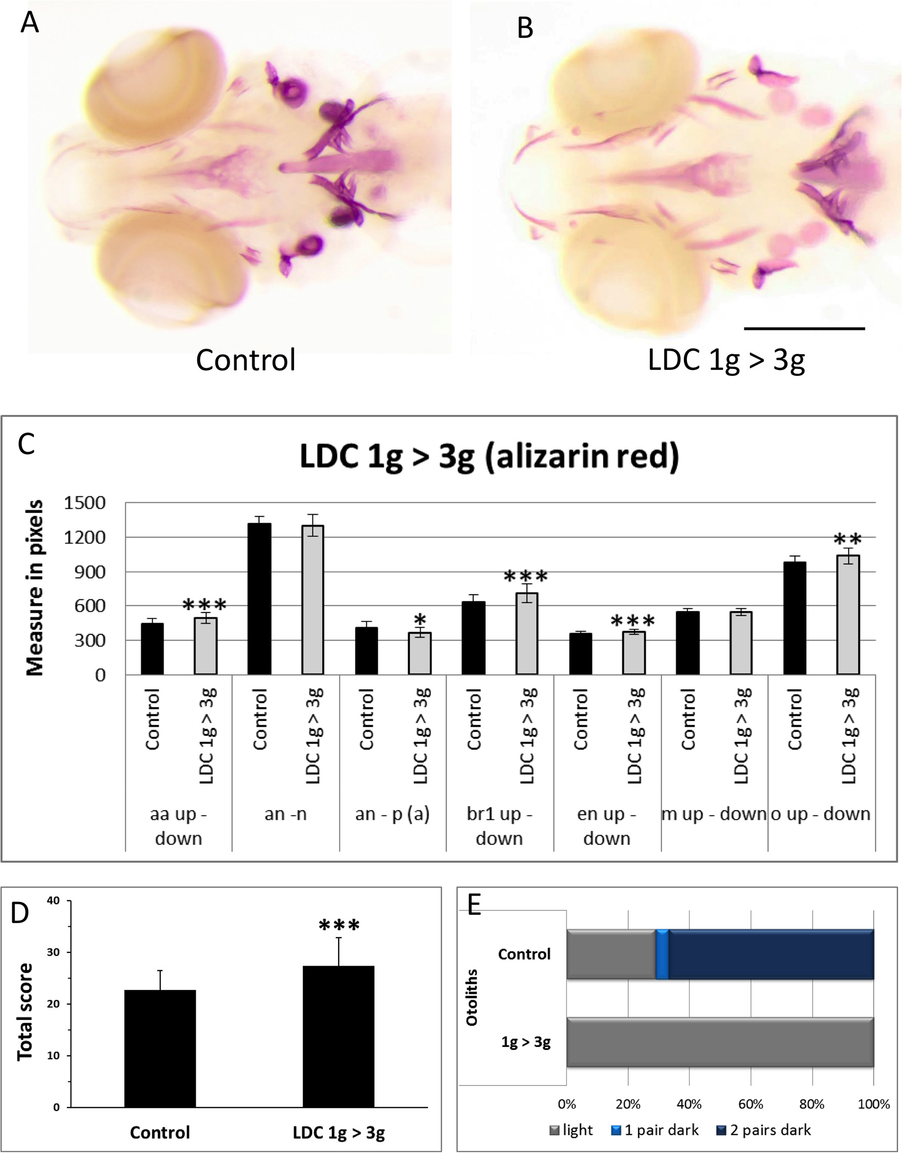 (A,B) Alizarin red staining of 9dpf control larvae (A) and larvae treated for 4 days in 3g hypergravity after 5 days at 1g (B). Ventral view, anterior to the left. (C) Comparison of morphometric measurements for some selected distances within the heads of control and 3g-treated larvae. Mean ± SD and t-test analysis were calculated for each measure on at least 20 individuals. * p < 0.05, ** p < 0.01 and ***p < 0.001. (D) Global score for bone formation in control and 3g treated larvae. (E) Comparison of cumulated frequencies of, respectively light, 1 pair dark or two pairs dark otoliths in control and 3g treated larvae. For abbreviations see legend to Fig 1.