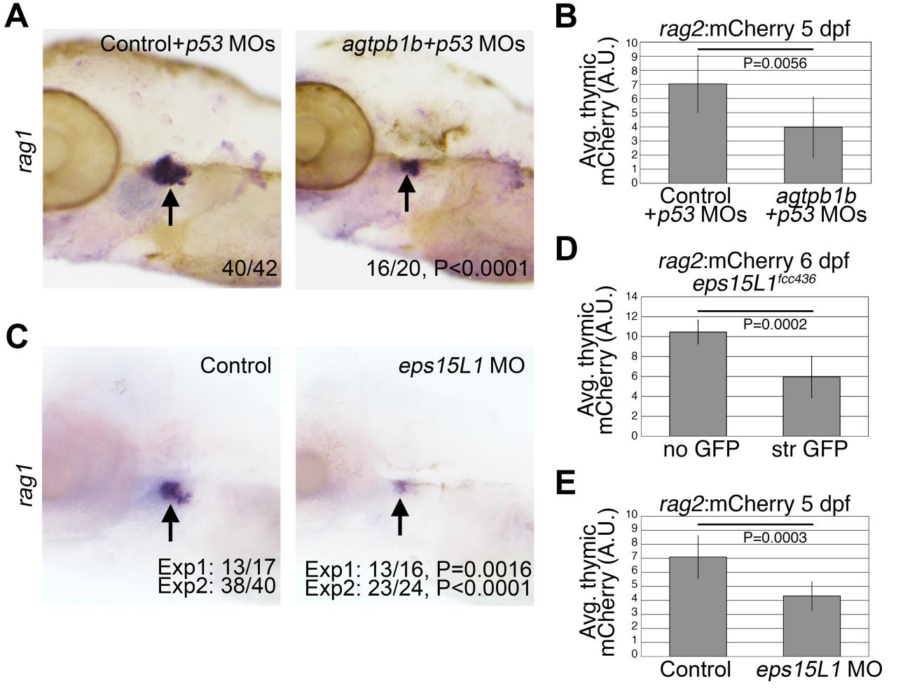 (A) WISH of rag1 in 5 dpf control and agtpbp1 morphants co-injected with p53 morpholino. N is indicated. Images show lateral views of the left side of the head. Arrows indicate rag1-expressing cells in the thymus. (B) Levels of rag2:mCherry transgene expression in the thymus of 5 dpf control and agtpbp1 morphants. Images of mCherry (B,D,E) in siblings were acquired using identical exposure settings. Fiji was used to quantify the whole mount expression from the acquired images (shown in S10 Fig). (C) WISH of rag1 in 5 dpf control and eps15L1 morphants. N is indicated. Two independent experiments were performed. Images show lateral views of the left side of the head. Arrows indicate rag1-expressing cells in the thymus. (D-E) Quantitation of the rag2:mCherry transgene expression in the thymus in lines eps15L1fcc436-P1 (436) siblings at 6dpf (D) and control and eps15L1 morphants at 5 dpf (E). P values for mCherry quantitation were determined using two-tailed Student’s T-test; P values for WISH were determined using Fisher’s exact test.