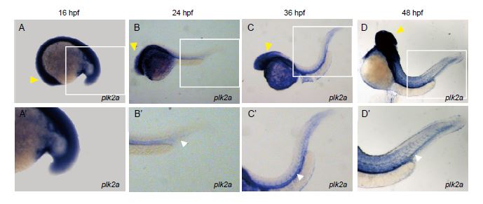 plk2a is expressed more broadly in the zebrafish brain/nervous system and weakly in the vasculature. (A–D) Whole mount RNA in situ hybridization shows that plk2a is expressed more broadly in the zebrafish brain and nervous system (yellow arrowheads) and weakly in the vasculature (white arrowheads) at 16 hpf (n=23/27), 24 hpf (n=37/38), 36 hpf (n=41/45) and 48 hpf (n=39/43). A′–D′ are enlarged images of the boxed area of A–D.