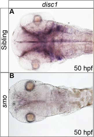 disc1 expression is absent in smob641 mutant embryos at 50hpf. Whole mount in situ hybridization analysis for disc1 expression in smob641 (B) revealed a near total loss of expression throughout the CNS and other tissues compared with sibling controls (A). Dorsal views, anterior to left.