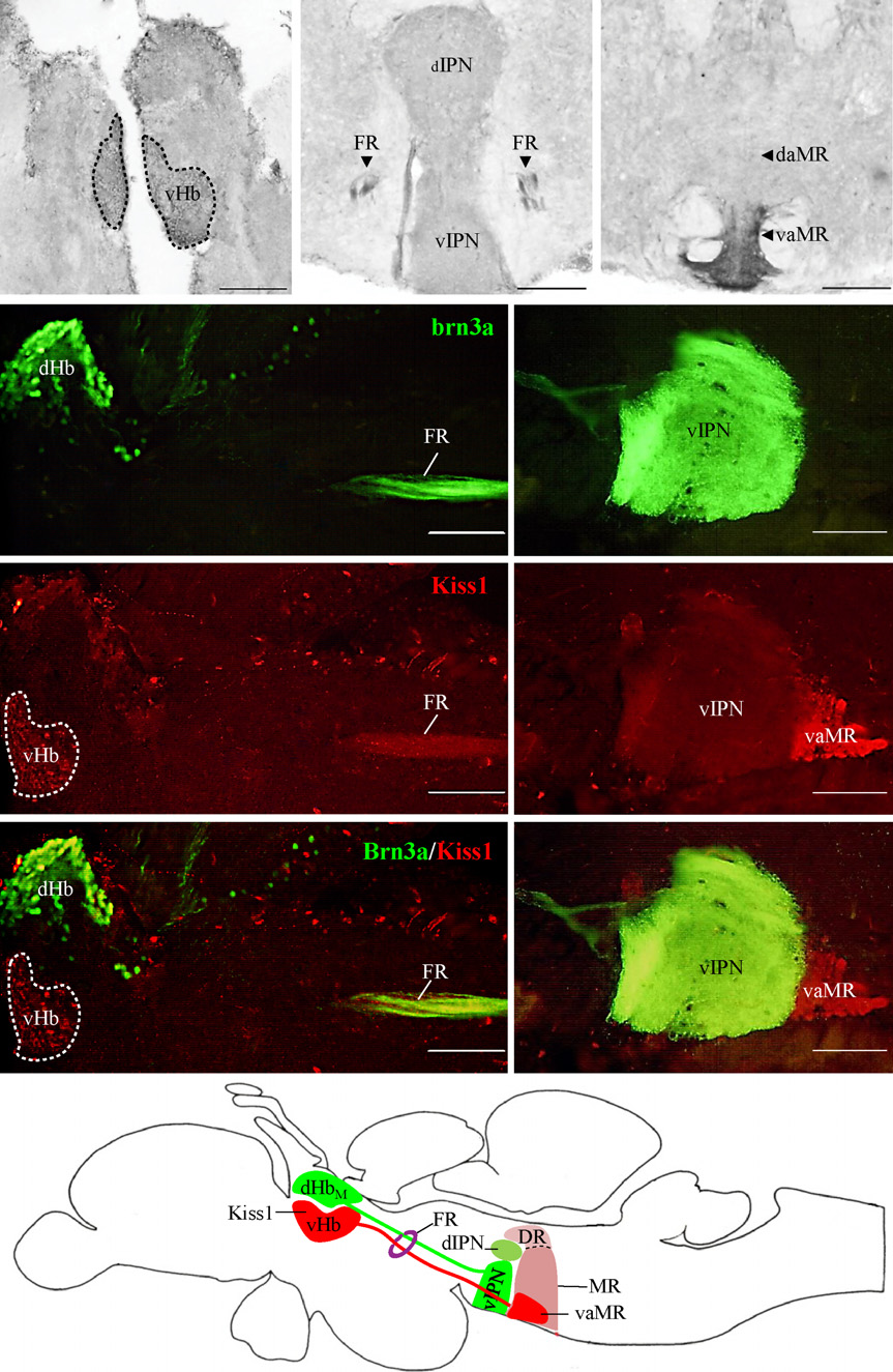 Kisspeptin 1 (Kiss1) projection in the zebrafish brain. (a–c) Kiss1-immunoreactive cells observed in the vHb (a) project through the fasciculus retroflexus (FR) (b) down to the vaMR (c). (d and e), Photomicrograph of sagittal section of Tg brn3a zebrafish expressing green fluorescent protein (GFP) in dHbM-vIPN pathway. (f–i) Kiss1-immunoreactive cells noted in vHb (red) and not in the dHb (green) with axonal projections coursing through the FR and terminating at the vaMR, a structure following the GFP-expressing vIPN. (j) Illustration depicts projections of dHbM and vHb through the FR to the vIPN and vaMR (a subregion of the MR) respectively as a representation of the sagittal images. Scale bars, 100 µm.