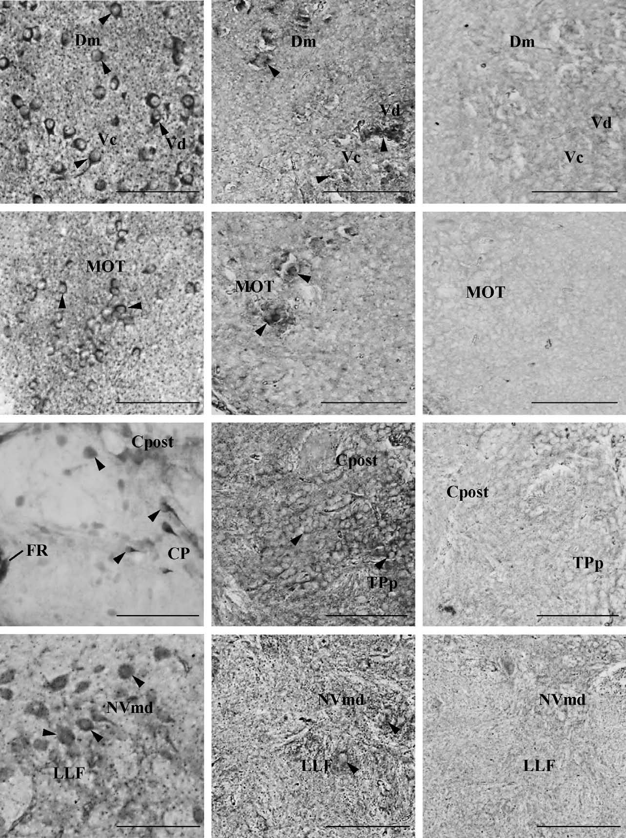 Kiss-R1-ir localization and kissr1b-derived protein 2 (KRBDP2) expression in other regions of the zebrafish brain. a1–d1, Kiss-R1-immunoreactive (-ir) cell somata observed outside of the habenula such as the forebrain (a and b), midbrain (c) and hindbrain (d) regions. a2–d2, KRBDP2 mRNA expression was also observed in same regions as Kiss-R1-ir cells. a3–d3, The sense riboprobe showed no expression of KRBDP2 mRNA. For abbreviations, see (Table 2). Scale bars, 100 µm.