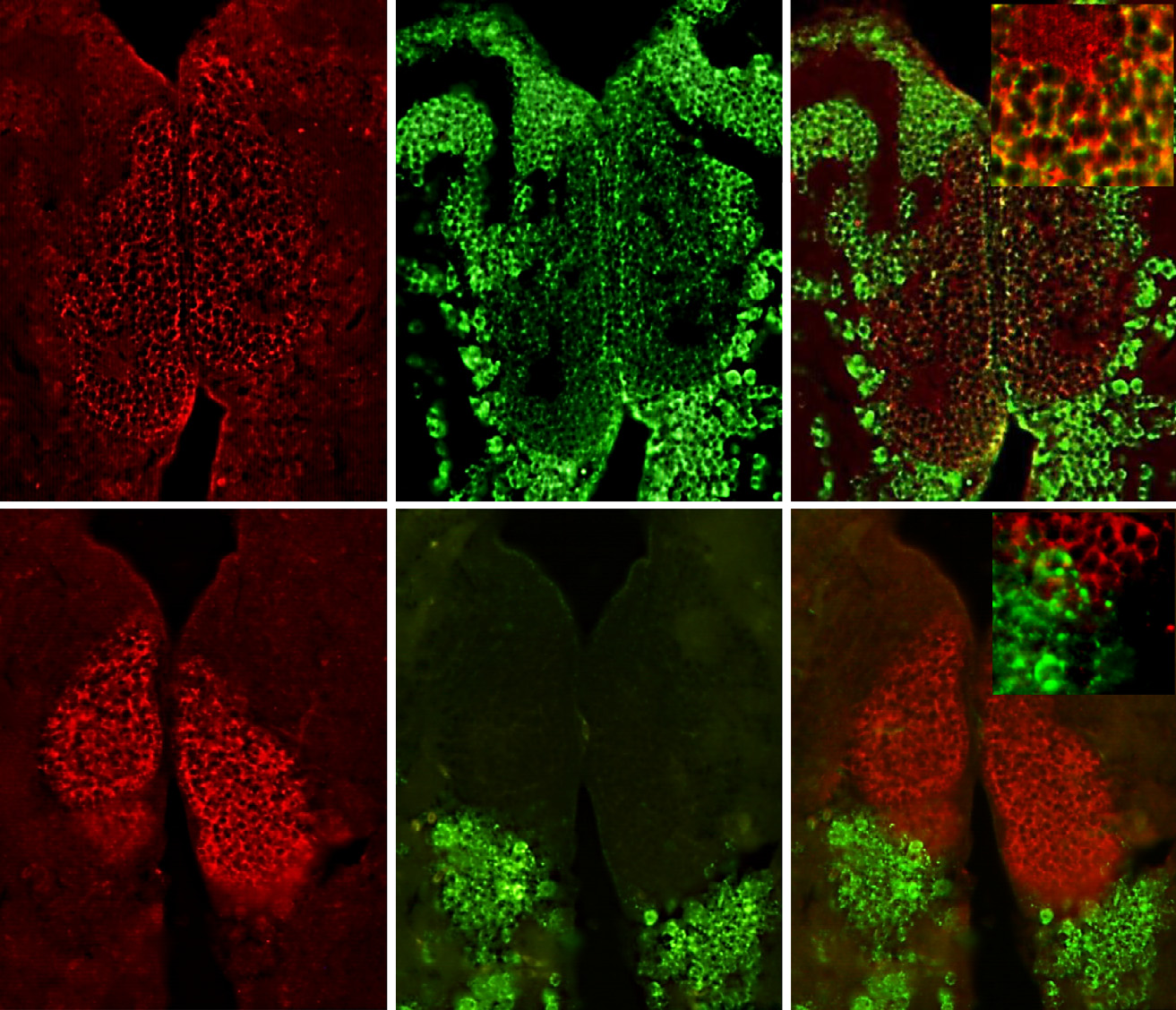Dual-fluorescence labeling of kisspeptin 1 (Kiss1) and Kiss-R1 (red) in glutamatergic and GABAergic neurons (green) in the habenula. (a–c) Photomicrographs showing some populations of Kiss1-immunoreactive (-ir) cells in the vHb that co-localized with cells expressing slc17a6b mRNA. Some individual Kiss1-ir fibers originating from the vHb co-localized with slc17a6b mRNA (as seen in the magnified confocal inset representing the region enclosed by the orange-dotted box; 60× plus 1.5× optical zoom; N.A. = 1.4; z-step = 0.15 µm). No co-localization was observed between Kiss1-ir cells and gad2 mRNA-expressing cells. A: anterior thalamic nucleus. Scale bars, (a–f) 100 µm and inset c and f: 50 µm.