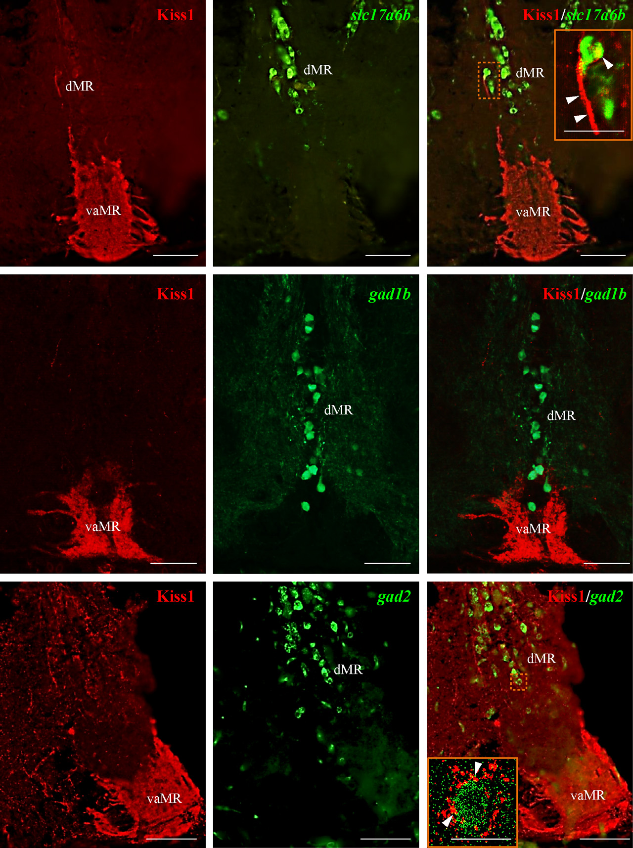 Dual-fluorescence labeling of kisspeptin 1 (Kiss1) (red) in glutamatergic and GABAergic neurons (green) in raphe nuclei. (a–c) In the raphe nuclei, Kiss1-immunoreactive (-ir) fibers were seen in close association with slc17a6b mRNA expressing neurons in the dMR as denoted by the confocal image (inset C). (d–f) green fluorescent protein (GFP)-labeled Gad1b neurons were observed only in the dMR with no close associations observed with Kiss1-ir fibers. G-I: Kiss1-ir fibers were seen in close association with gad2 mRNA expressing neurons in the dMR, denoted by the confocal image (inset I; 60× plus 1.5× optical zoom; N.A. = 1.4; z-step = 0.15 µm). Presence of actual space of at least 0.15 µm noted between fibers and cells. Scale bars, (a–i): 100 µm; inset C and I: 50 µm.