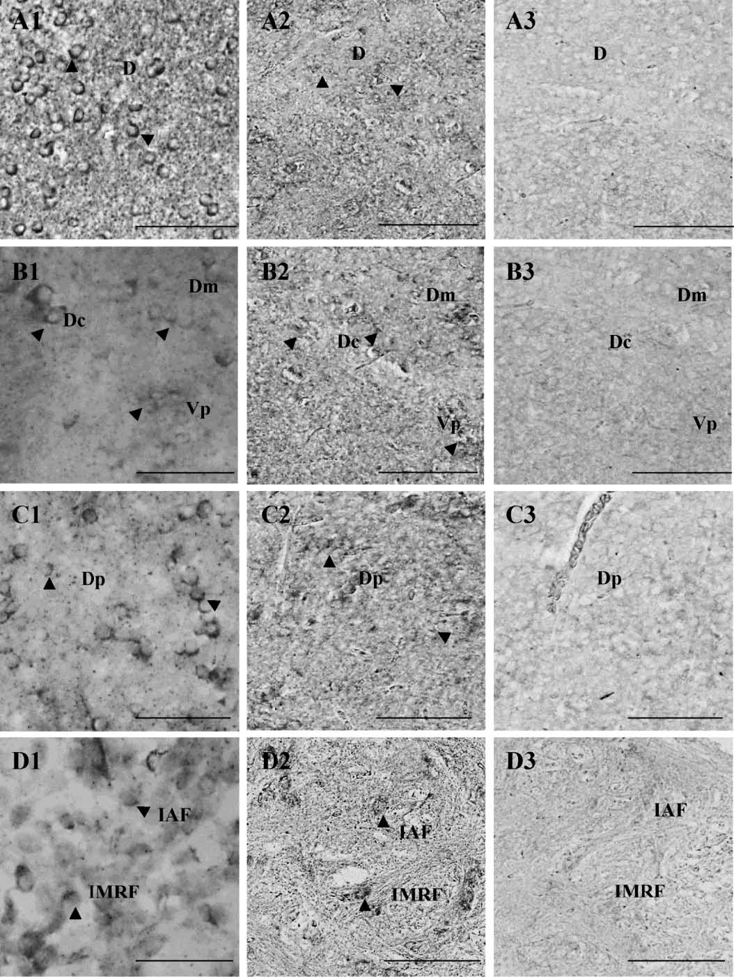 Fig. S1 Kiss-R1-ir localization and KRBDP2 expression in other regions of the zebrafish brain. A1-D1, Kiss-R1-immunoreactive (-ir) cell somata observed outside of the habenula such as the dorsal telencephalic area (A1), central, medial (B1) and posterior (C1) zone of dorsal telencephalic area, postcommissural nucleus of ventral of the ventral telencephalic area (B1), inner arcuate nucleus and intermediate reticular formation (D1). A2-D2, KRBDP2 mRNA expression was also observed in same regions as Kiss-R1-ir cells. A3-D3, The sense riboprobe showed no expression of KRBDP2 mRNA. For abbreviations, see Table 2. Scale bars, 100 µm.