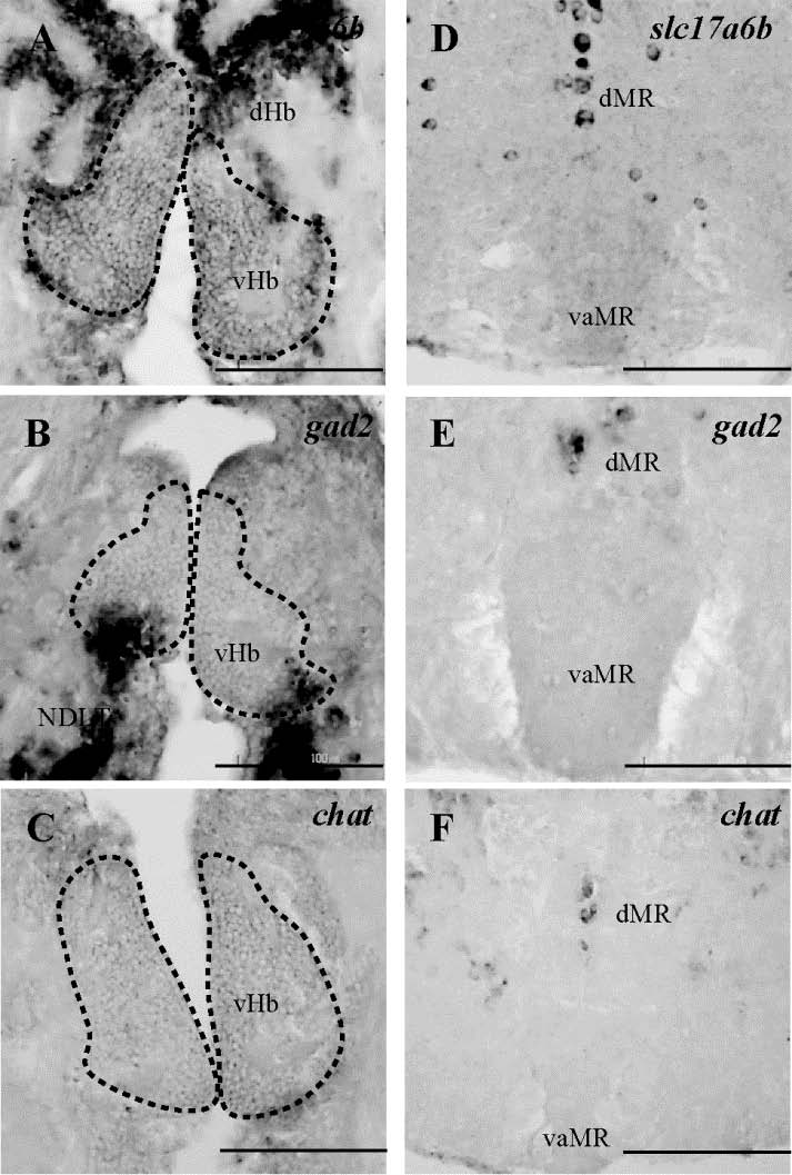 Fig. S2 Expression of slc17a6b, gad2 and chat mRNAs in the habenula and raphe regions. A and D, slc17a6b mRNA was noted in some population of cells in the vHb and in the dMR and sparsely in the DR. B and E, gad2 mRNA expressing cells was observed as a minute population in the ventral region of the vHb and in the dMR. C and F, chat mRNA was weakly present in the vHb with some cells in the dMR and DR. Scale bars, 100 µm.