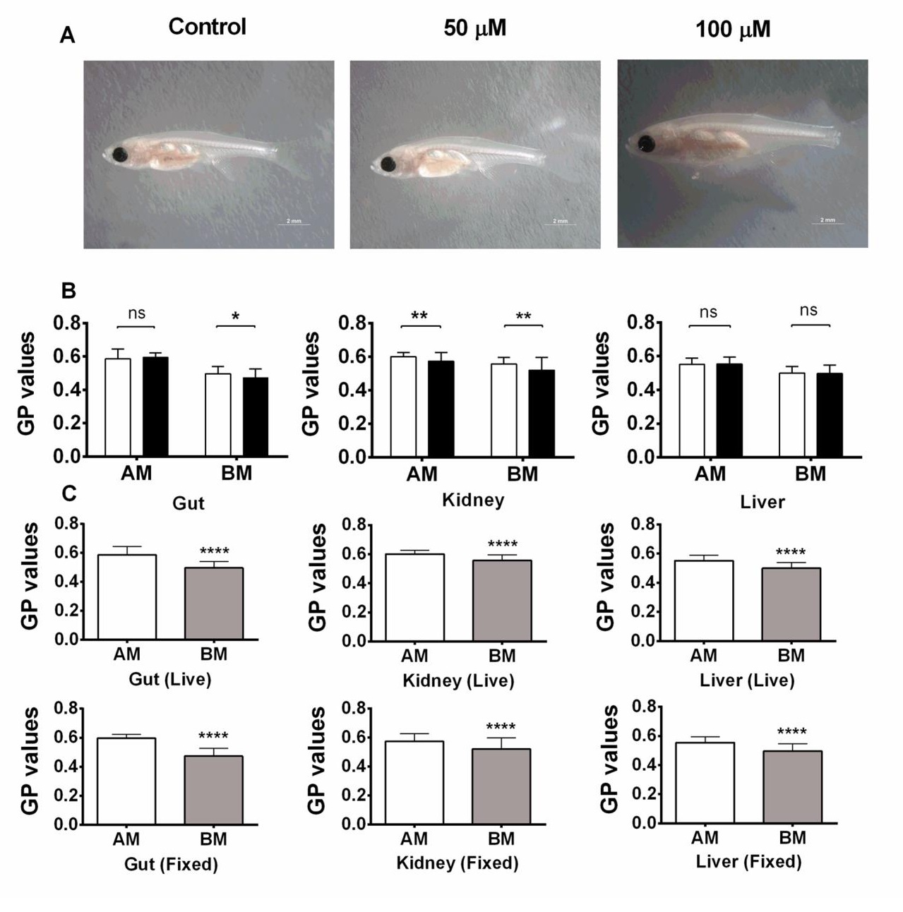 Laurdan microscopy for zebrafish larvae. A) Zebrafish larvae were treated with 0 µm (i) 50 µm (ii) or 100 µm (iii) Laurdan at 3 dpf with for 30 min, then washed and grown to 1-month-old fish. Photographs were taken with a standard digital camera. Scale bars = 2 mm. B–C) Comparison of Laurdan GP values of the apical (AM) and basolateral (BM) membranes of gut, kidney and liver of 6 dpf zebrafish larvae that were imaged live (white bars in B) and after fixation with paraformaldehyde (black bars in B). Data are mean and standard deviations of 50 regions of interests obtained in 10 larvae. In (B), ns, not significant, p > 0.05; *p < 0.05; **p < 0.01 between fixed and live larvae. In (C), ****p < 0.0001 between apical (AM) and basolateral (BM) membranes in live and fixed larvae (Student t-test).