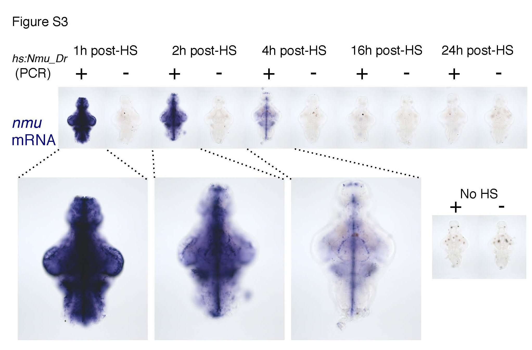 Time course of Nmu overexpression (Related to Figure 3). Larvae from a hs:Nmu_Dr /+ to WT mating were heat shocked for 1 hour at 37oC at 5 dpf and fixed at the indicated times after heat shock. ISH was then performed using an nmu-specific riboprobe on dissected larval brains. Transgenic and WT larvae were subsequently identified by PCR. Ubiquitous nmu overexpression was observed at 1 hour post-heat shock, with reduced levels at 2 and 4 hours post-heat shock. No ectopic transcript was observed at 16 and 24 hours post-heat shock. No ectopic nmu expression was observed in non-heat shocked transgenic brains (No HS, insert). Chromogenic development was stopped at the same time for all samples prior to the visualization of endogenous nmu transcript. While this data shows that ectopic nmu transcript levels are ubiquitously elevated for a few hours after heat shock, the perdurance of Nmu peptide is not known.