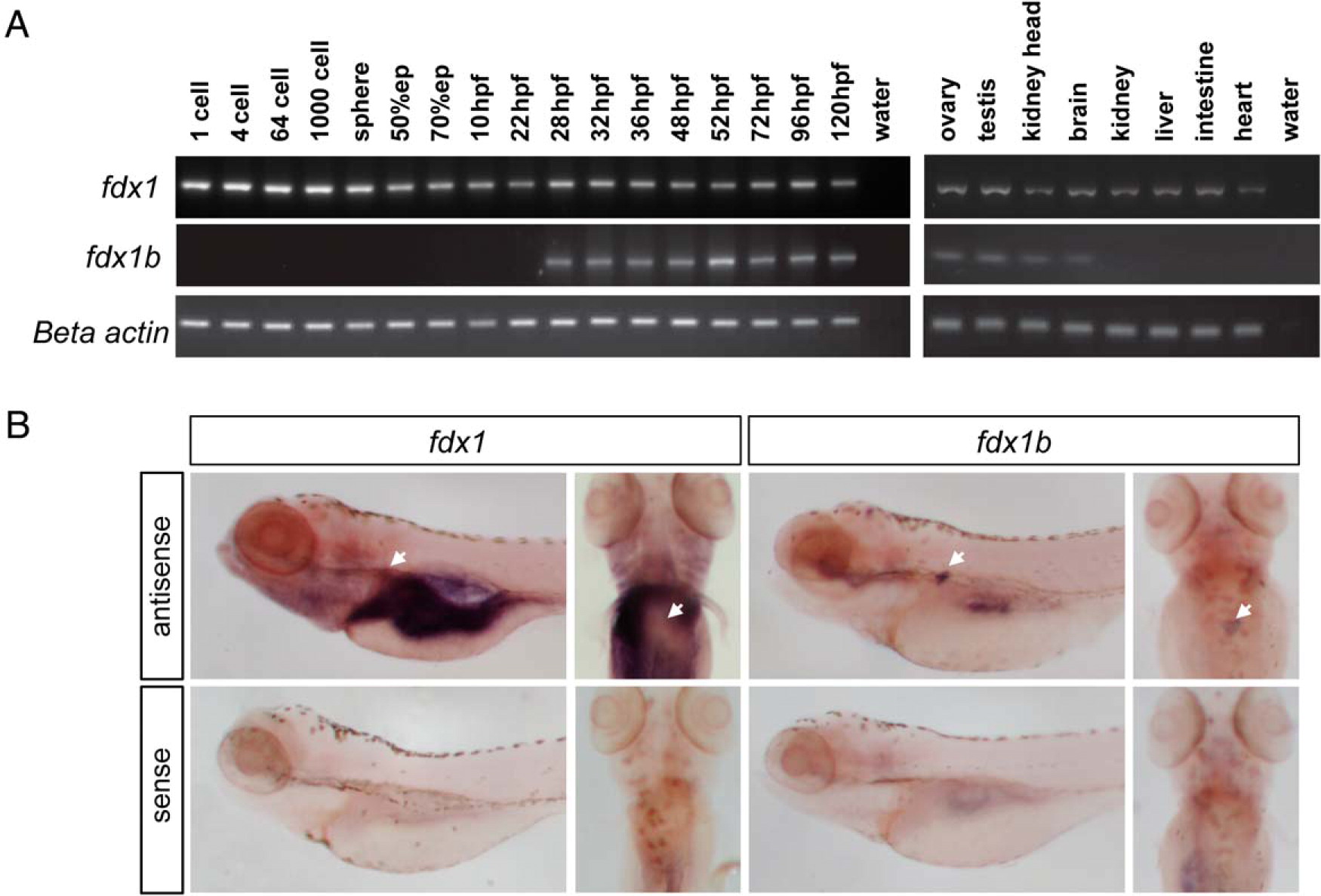 A, Expression of fdx1 and fdx1b was characterized in zebrafish during development and in adult tissues. Representative agarose gel images are shown from triplicate experiments from pools of 10 zebrafish embryos or larvae at the specified developmental stages or from adult tissues. β-Actin was used as a control for integrity of template cDNA. B, Detection of fdx1 and fdx1b mRNA at 120 hpf by WISH. Lateral and dorsal views are shown. Negative control sense probes did not show staining. Arrow indicates location of the interrenal gland.