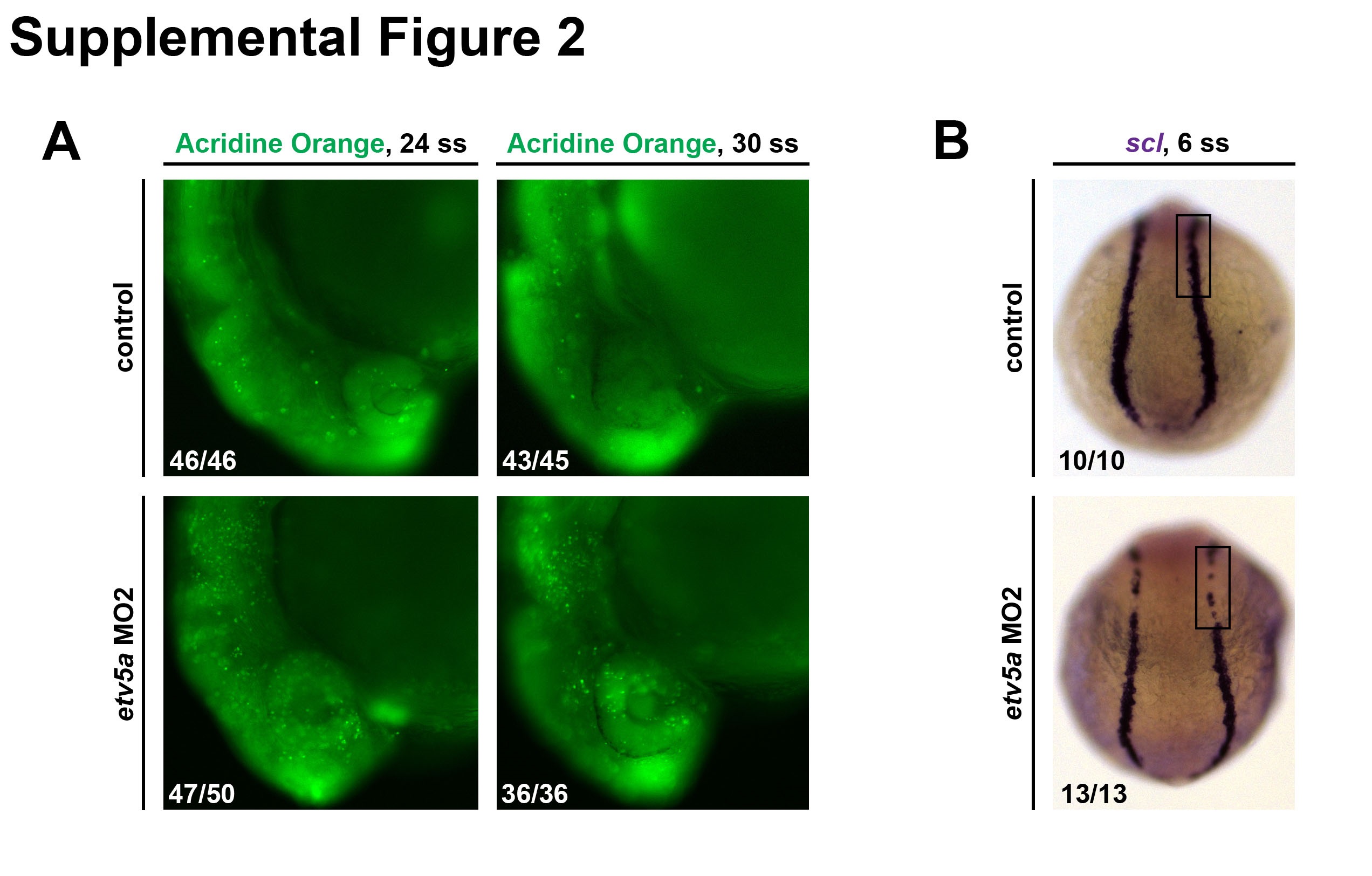 Fig. S2 etv5aMO2 assays. (A) Embryos injected with etv5a MO2 have more cell death, as shown by AO staining, in the head region compared to control embryos at the same time points. However, the amount of cell death is reduced in etv5a MO2 injected embryos from the 24 ss to the 30 ss. (B) WISH analysis on 6 ss embryos shows reduced scl (purple) expression in embryos injected with etv5a MO2. Embryo counts for each observed phenotype are as indicated in the lower left corner of the corresponding panel. For control 30 ss, 2/45 embryos had elevated AO cell numbers compared to the majority phenotype that is shown, and for etv5a MO2 24 ss, 3/50 embryos had further elevated AO cell numbers compared to the majority phenotype that is shown.