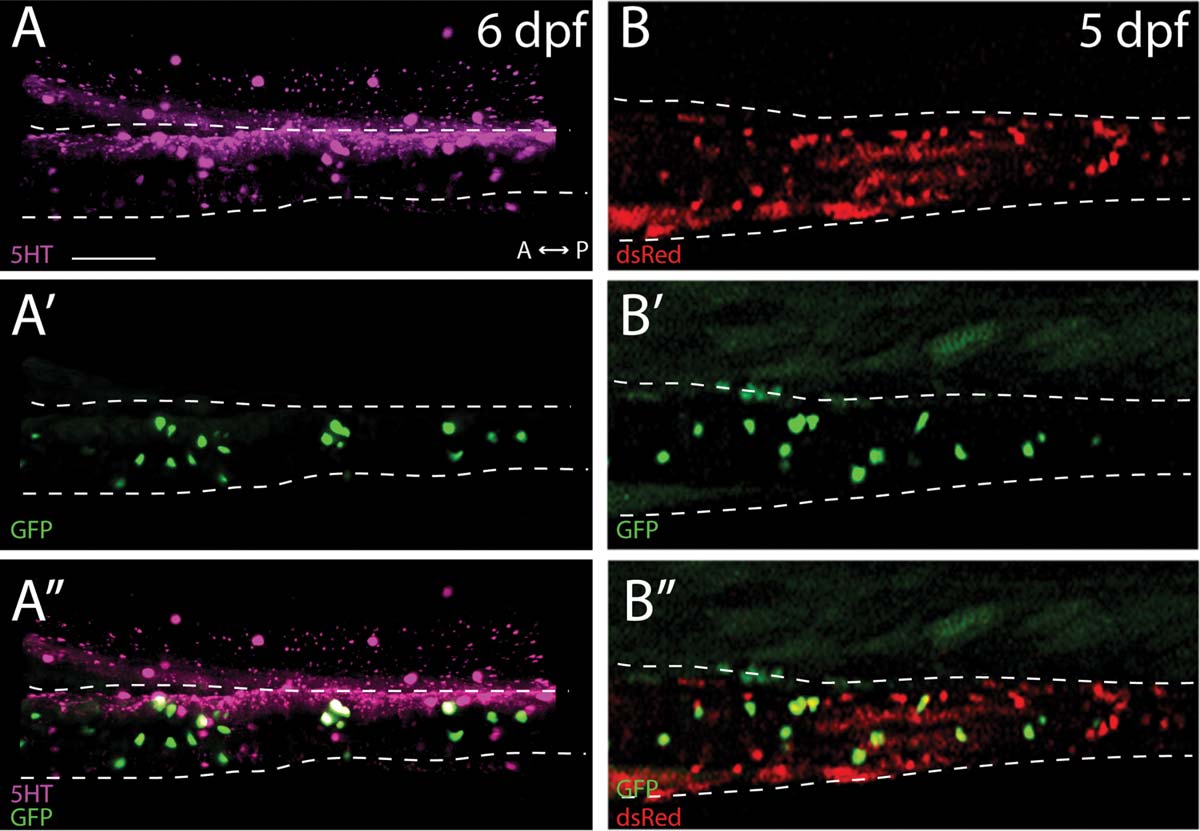 ptf1a:GFP cells are largely serotonergic enteric neurons that are derived from the neural crest. Maximum projection confocal stack of the midgut (A-A′′) reveal that ptf1a:GFP+ cells co-localize with the neurotransmitter 5HT at 6 dpf. (B-B′′) Images of live triple transgenic larval fish, ptf1a:GFP;-4725sox10:Cre;elf1a:loxp-GFP-loxp-dsRedpA, shows that ptf1a:GFP+ cells are neural crest derived. Scale bar: 70 µm.