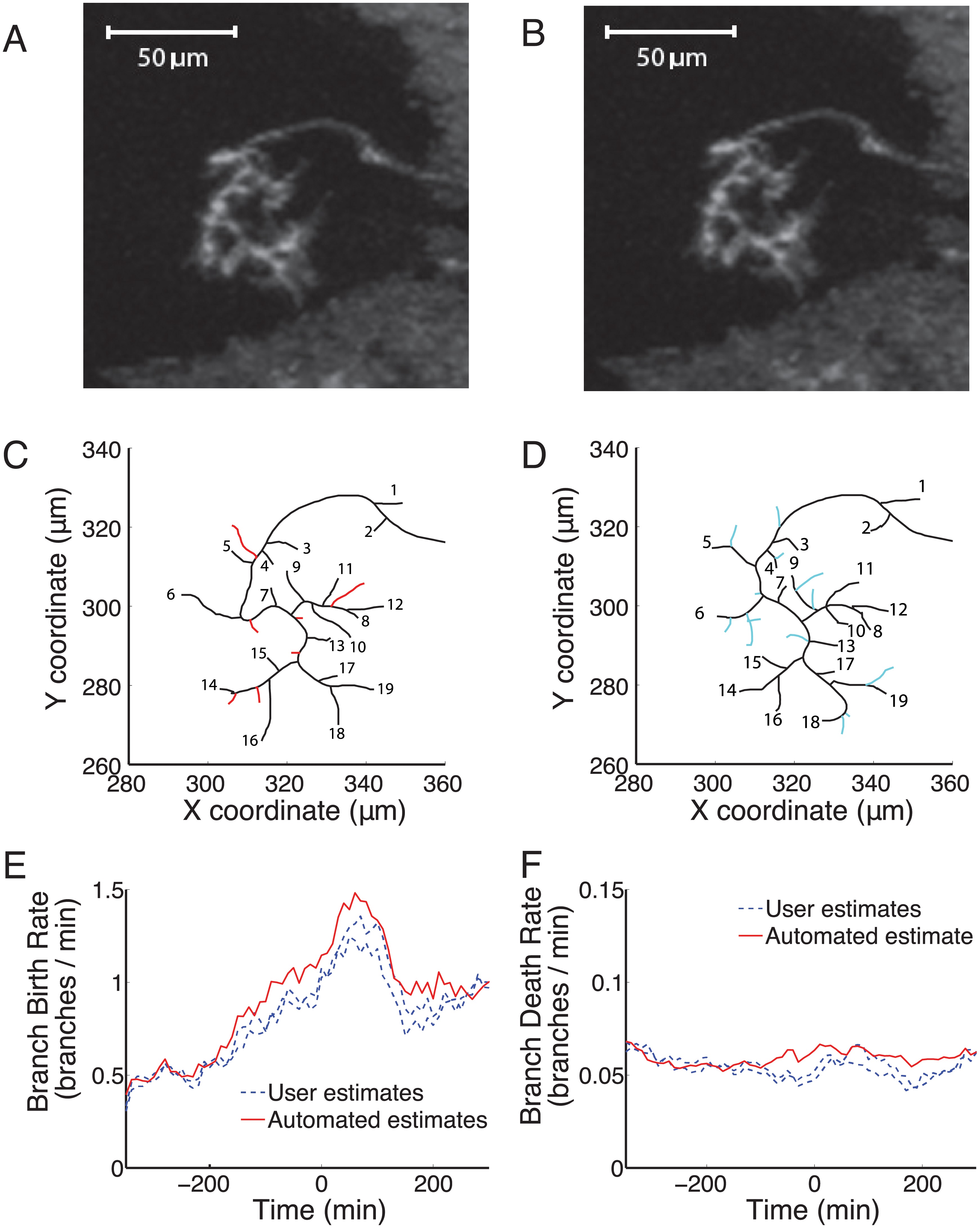 (A) & (B): The original images of a control axon in two consecutive frames. (C): Seven branches (red) were removed completely or “died” between the two frames. (D): Thirteen new branches (cyan) were added or “born” in the ten minutes between the frames. Nineteen branches (numbered in both A and B) survived the interval (black), though they could have extended, retracted or shifted. (E): The branch birth rate for the DTW identified branches (automated, red line) was similar to that of two human users (dashed blue lines) who manually identified branches in one movie. (F): The death rate was comparable for branches either identified by DTW (automated, red line) or manually by two human users (dashed blue lines).
