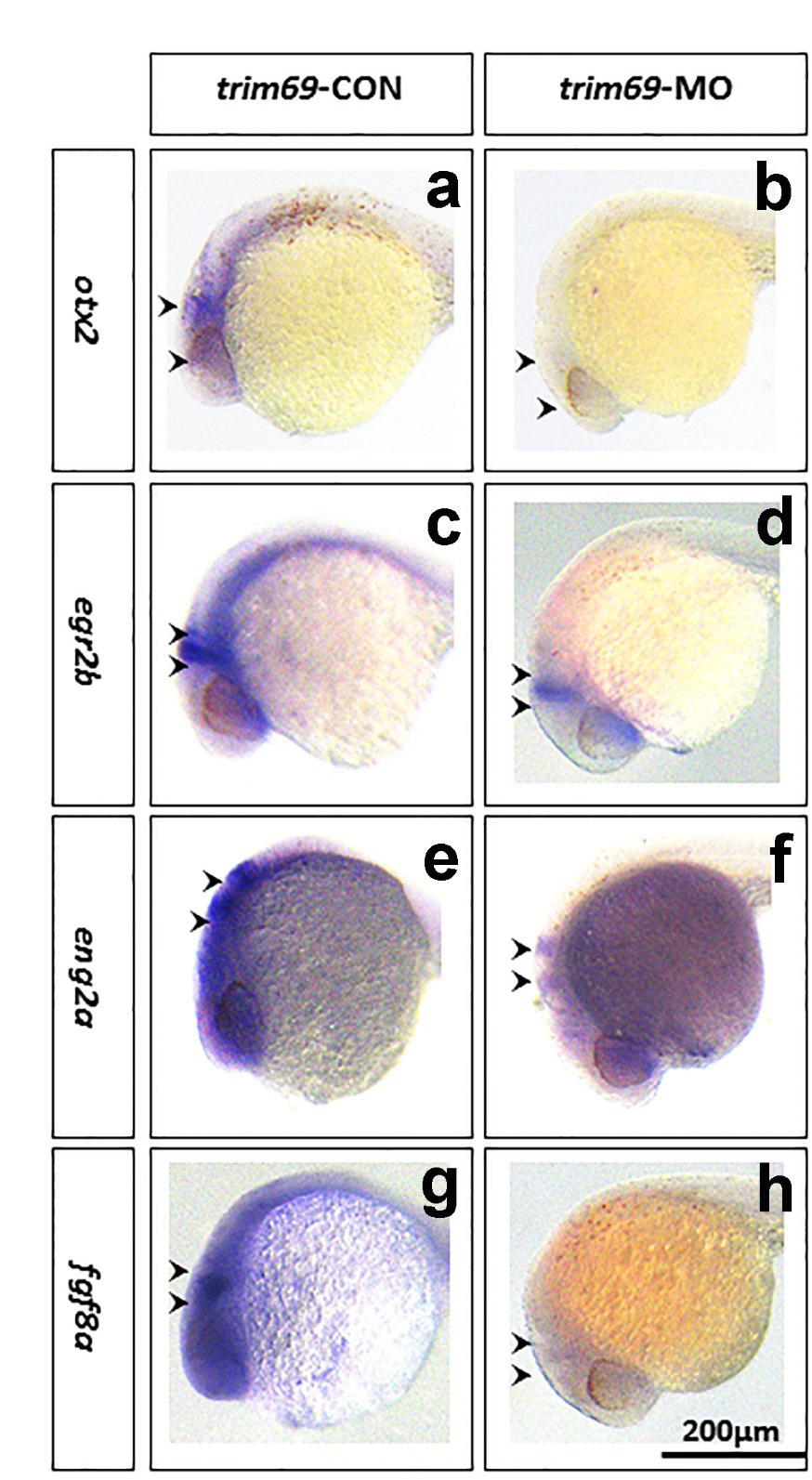 Expression of brain region specific markers detected byin situhybridization. Detection of the expression ofotx2 (marker of forebrain and MHB), eng2a (marker for MHB and hindbrain), egr2b (marker for MHB and hindbrain), and fgf8a (marker for forebrain and MHB) after loss oftrim69 by in situ hybridization.trim69-CON: control group; trim69-MO: trim69 knocking down; black arrow indicates positive signals; scale bar: 200µm.