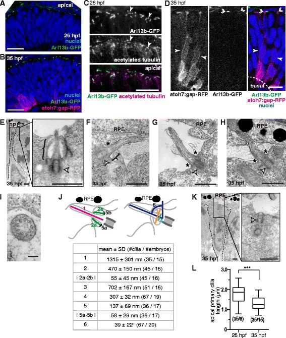 Main features of apical primary cilia in the early differentiating retinal neuroepithelium. The embryonic zebrafish retinal neuroepithelium was analyzed using confocal microscopy and TEM. a-b 26 hpf embryos expressing Arl13b-GFP (localized to primary cilia) (a) or double transgenic 35 hpf embryos expressing Arl13b-GFP and atoh7:gap-RFP (expressed in progenitors during the last cell cycle and in RGC neuroblasts) (b) were fixed and analyzed in toto using confocal microscopy. A 3D maximum intensity projection of a 3 µm-thick confocal stack is shown. c 26 hpf embryos expressing Arl13b-GFP were immunolabeled with anti-acetylated tubulin antibody. A maximum intensity projection of a 3 µm-thick stack of the apical region of the neuroepithelium is shown. The arrowheads show primary cilia with Arl13b-GFP and acetylated tubulin labeling. d Single confocal plane with a detail of the stack shown in b. It is possible to observe cells bearing a primary cilium (double arrowhead) and expressing low levels of gap-RFP (full arrowheads). e-h TEM micrographs showing examples of apical primary cilia, either with a complete (e, bracket), incomplete (f, bracket - asterisk) or absent ciliary pocket (g and h, asterisks). Primary cilia in close contact with RPE cells were also observed (h). The basal body is indicated with a white arrowhead. i Cross section of an apically localized primary cilium. j Morphological parameters of apical primary cilia of 35 hpf embryos obtained from measurements performed on TEM micrographs. Measured features are summarized in the upper diagrams, and values (mean ± standard deviation) shown in the lower table. k TEM micrograph showing a basal body (white arrowhead) associated with the apical plasma membrane but lacking an axoneme. l Comparison of apically-localized primary cilia length at 26 and 35 hpf. The numbers in brackets represent the number of cilia / embryos measured in each case. (***) p < 0.001, Student’s t test. RPE: retinal pigment epithelium. Scale bars: A-B, 20 µm; C-D, 10 µm; E, 1 µm; F-H, 0.5 µm; I, 0.1 µm; K, 1 µm