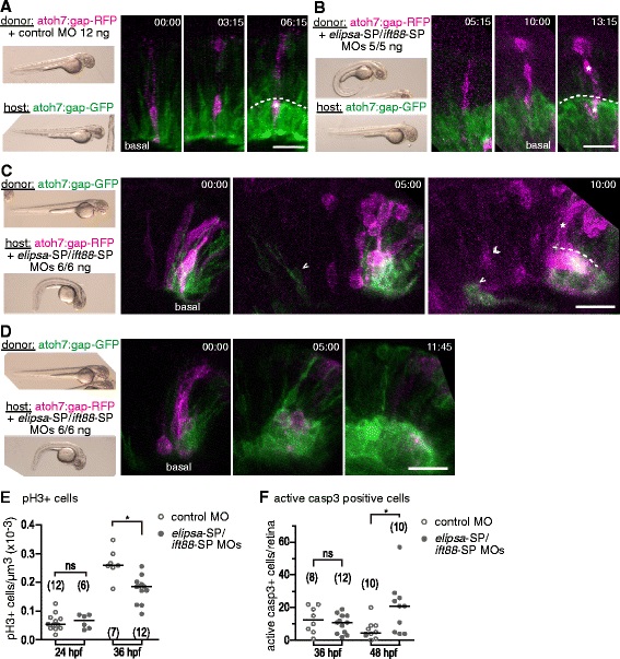 Cell-autonomous effect of cilia reduction on RGC differentiation. a-b Blastomeres from atoh7:gap-RFP embryos injected with control MO (12 ng) (a) or elipsa-SP/ift88-SP MOs (5/5 ng) (b) were transplanted into atoh7:gap-GFP hosts. The dotted line indicates de apical margin of the RGC layer of the host and the asterisk denotes the donor cells with high RFP expression. c-d Blastomeres from un-injected atoh7:gap-GFP embryos were transplanted into atoh7:gap-RFP hosts injected with elipsa-SP/ift88-SP MOs (6/6 ng). Retinas with small (c) and large (d) clones of GFP positive cells were observed. In C the dotted line indicates de apical margin of the RGC layer formed by the donor GFP positive cells, and the asterisk denotes host cells with high RFP expression. Single arrowheads mark GFP expressing cells that appear before RFP expressing cells (double arrowheads). In all the cases (a-d) the resulting host embryos were imaged by time-lapse confocal microscopy beginning at around 30 hpf. Fluorescence images show montages from 3D maximum intensity projections of the stacks from three different time points. On the left, the external phenotype at 48 hpf of the donor and host embryos is shown in each case. Time is expressed in hrs:min. Scale bars: A-D, 20 µm. e Comparison of the number of mitotic cells (identified by anti-pHistone H3 labeling) in the ventro-nasal region of 24 and 36 hpf retinas, expressed as the number of positive cells per unit of volume. (*) p = 0.0014. f Comparison of the number of apoptotic cells (identified by anti-activated Caspase 3 labeling) per retina in 36 and 48 hpf embryos. (*) p = 0.009. All experiments were performed twice, with similar results; only the results from one of the experiments are shown. The numbers in brackets represent the number of embryos quantified in each case (we quantified one eye per embryo). (ns) non-significant difference. Comparisons were made using rank transformation and Student’s t test
