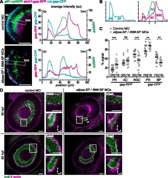 Cilia impaired embryos show a preferential delay in RGCs formation. a Left: average intensity Z-projections of 10 µm-thick confocal stacks of the nasal region of retinas from 48 hpf SoFa1 embryos injected with control MO or elipsa-SP/ift88-SP MOs. The dotted line delimits the area used to measure the fluorescence intensity profile from apical to basal, plotted in the right side for each image. ap: apical; bas: basal; au: arbitrary units. b Diagram indicating the regions in the SoFa1 retina fluorescence profile plots that were selected to determine the relative contribution of each cell type to the total signal in RFP and CFP channels (the GFP signal was only used to determine the extension spanned by amacrine cells in the RFP channel). The boundaries of each region were set at the distance corresponding to 50 % of the maximum fluorescence for each peak. c Plot of the percentage of signal intensity in the gap-RFP and gap-CFP channels corresponding to each cell type in embryos injected with control MO or elipsa-SP/ift88-SP MOs. The number of embryos analyzed in each case is shown in brackets. (***) p < 0.001, (**) p < 0.01, ns: non-significant difference. Comparisons were made using rank transformation and Student’s t test. PR: photoreceptors; AC: amacrine cells; RGC: retinal ganglion cells; BP: bipolar cells. d Confocal images of retinas from wild-type embryos injected with control MO or elipsa-SP/ift88-SP MOs and fixed at 48 and 60 hpf. The boxed regions were magnified in the upper insets, while lower images are orthogonal 3D projections of these insets. The white arrowhead indicates a patch of IPL in the region adjacent to the optic nerve exit. Scale bars: A, 50 µm; D, 30 µm