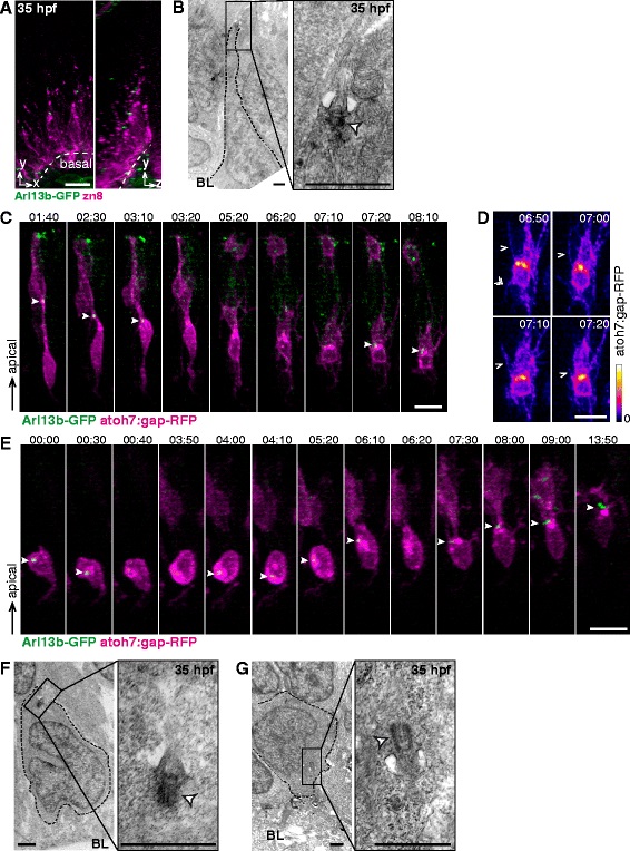 Upon completion of apical retraction, primary cilia may transiently disappear or lose their apical localization. a 3D maximum intensity projections of a region of the retina of a 35 hpf transgenic embryo expressing Arl13b-GFP and immunolabaled with zn8 antibody to identify RGCs. Primary cilia are observed colocalizing with the apical tip of cells finishing retraction. b TEM micrograph from a 35 hpf embryo showing a primary cilium at the tip of an apical process. The white arrowhead indicates the basal body. c-e Blastomeres from transgenic embryos (atoh7:gap-RFP/Arl13b-GFP) were transplanted into wild type hosts. The resulting embryos were imaged by time-lapse confocal microscopy from around 30 hpf onwards. Montages from 3D maximum intensity projections of the stacks are shown. (d) Detail of the cell shown in (c), where initial filopodial activity (arrowheads) previous to dendrite formation is observed; in order to highlight atoh7:gap-RFP signal intensity, a color ramp is used. The full white arrowheads indicate the presence and position of the primary cilium in c and e. f-g TEM micrographs from 35 hpf embryos, showing cells located in the basal region of the neuroepithelium (RGC neuroblasts) with primary cilia both in apical (f) and basal (g) positions. The white arrowhead indicates the basal body. BL: basal lamina. Scale bars: A, 10 µm; B, 1 µm; C-E, 10 µm; F-G, 1 µm