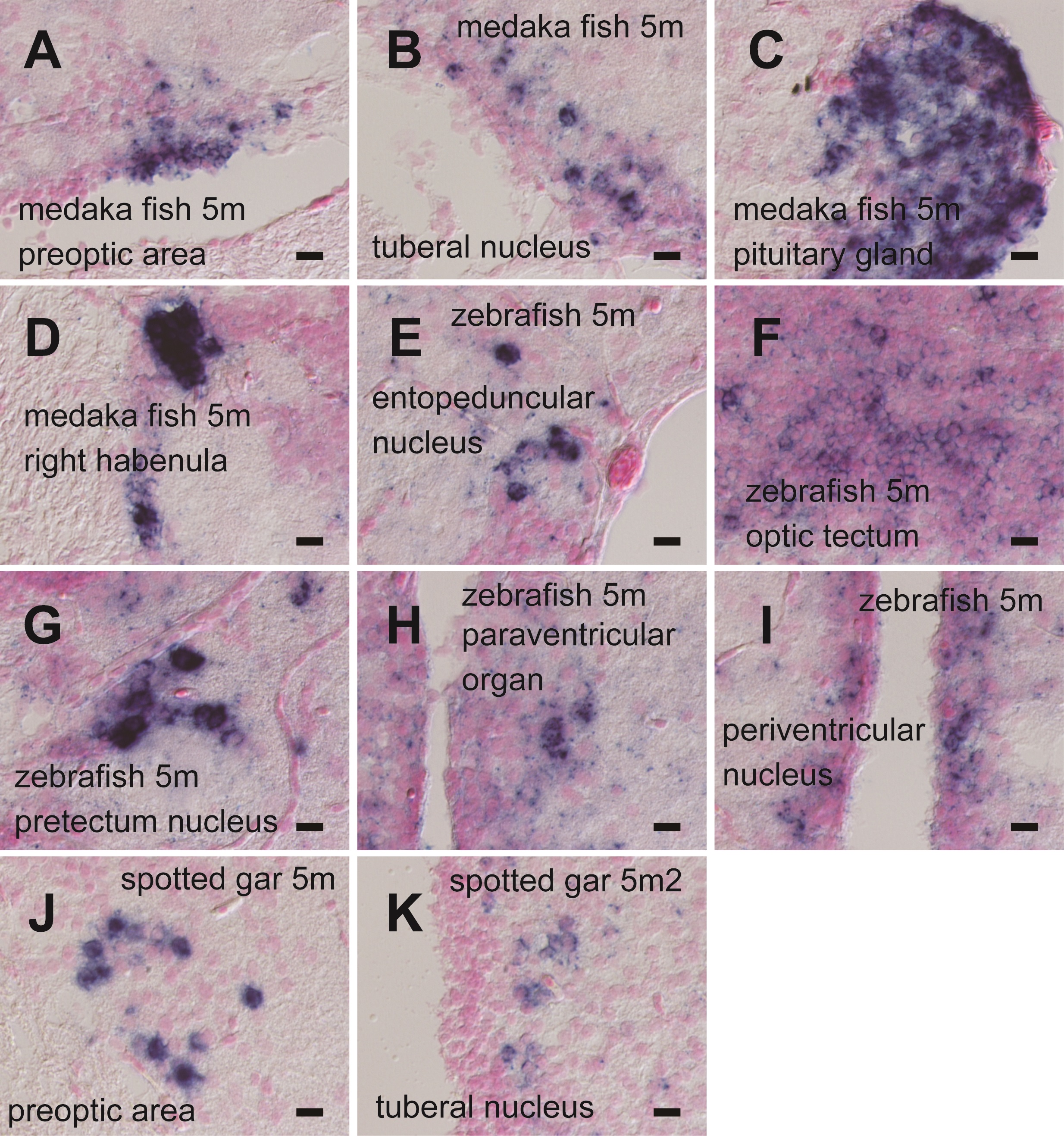 (A) Medaka fish Opn5m in preoptic area. (B) Medaka fish Opn5m in tuberal nucleus. (C) Medaka fish Opn5m in pituitary gland. (D) Medaka fish Opn5m in right habenula. (E) Zebrafish Opn5m in entopeduncular nucleus. (F) Zebrafish Opn5m in optic tectum. (G) Zebrafish Opn5m in pretectal nucleus. (H) Zebrafish Opn5m in paraventricular organ. (I) Zebrafish Opn5m in periventricular nucleus. (J) Spotted gar Opn5m in preoptic area. (K) Spotted gar Opn5m2 in tuberal nucleus. Scale bar: 10 µm.