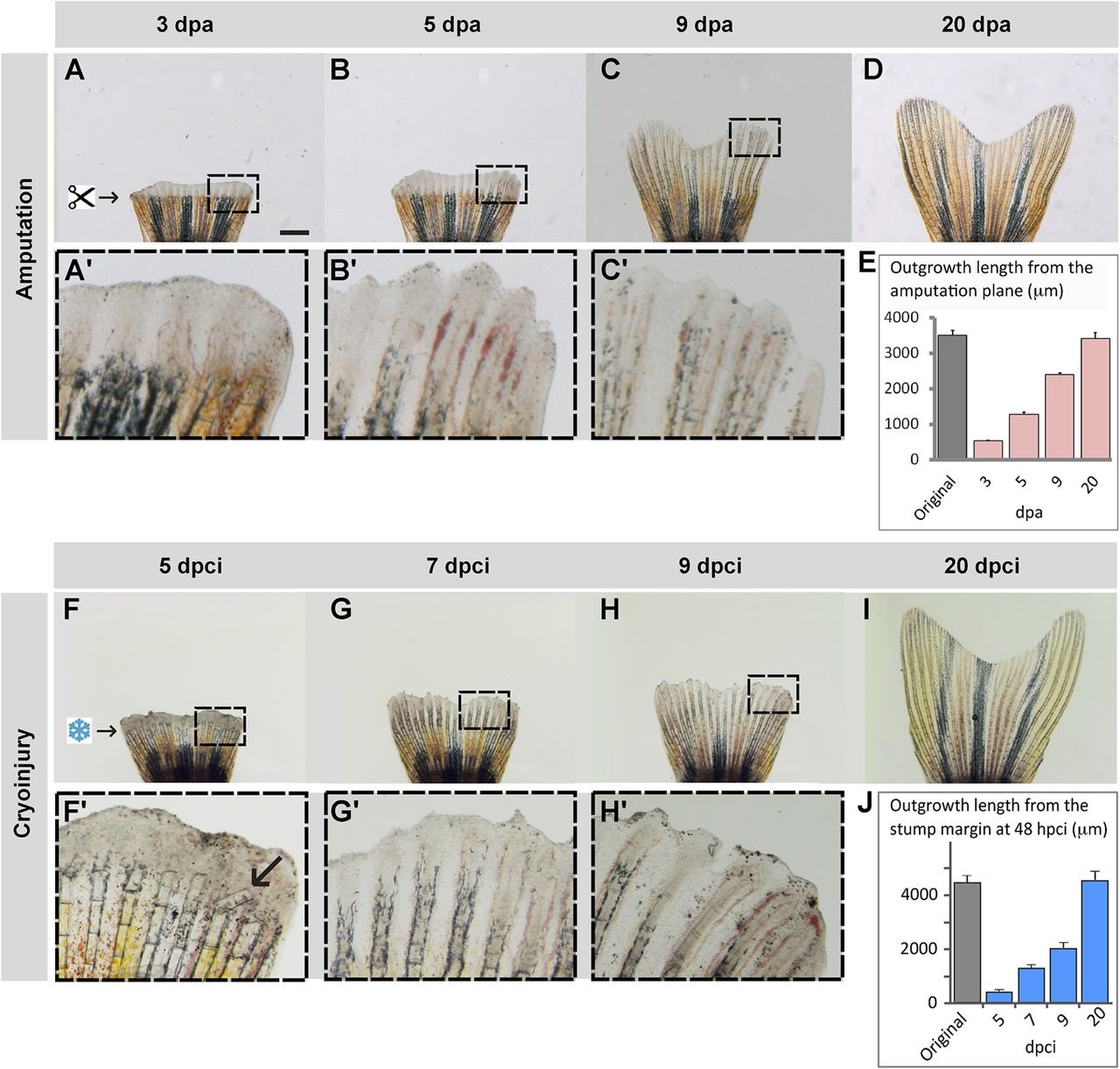 Truncation of the damaged fin tissue is followed by resumed regeneration. (A-D) Time-lapse imaging of fins after amputation during the outgrowth-formation, with boxed areas magnified in A′-C′. (F-I) Time-lapse imaging of fins after cryoinjury during the regenerative phase, with boxed areas magnified in F′-H′. Despite a delay of fin loss and partial damage of the stump, the regenerate reproduces a normal shape of the original fin within 20days. (F2) Arrow indicates a broken bone. (E,J) Quantification of the fin regeneration after amputation (E) and cryoinjury (J). The length of the 3 longest lateral rays was measured from the stump margin after fin loss to the distal tip of the regenerate at different time-points. Error bars represent s.e.m., N=4 fins. Scale bar in A=1mm.