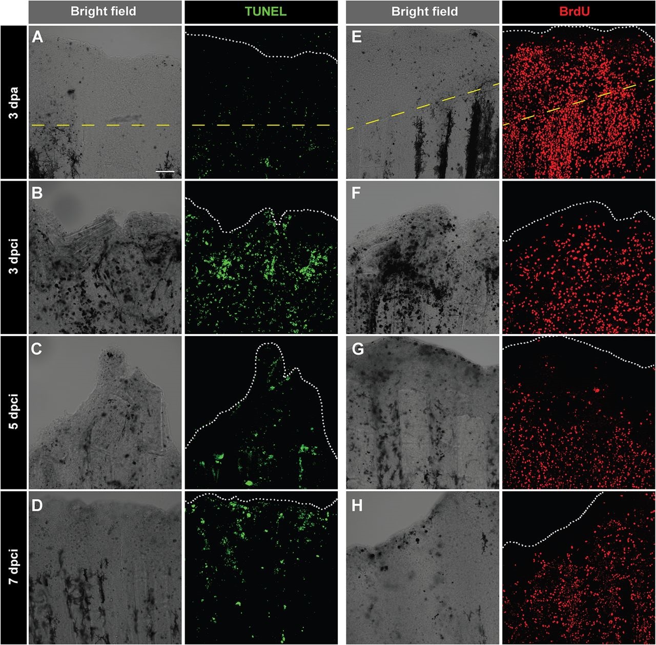 Enhanced cell proliferation and upregulation of tissue remodelling protein during regeneration of cryoinjured fins. (A-D) TUNEL labelling (green) of whole-mount fins at 3dpa (A) and at different time points after cryoinjury (B-D). At 3dpa (A), TUNEL staining is nearly absent. At 3dpci (B), 5dpci (C) and 7dpci (D), tissue debris (dark structures in bright-field images) are associated with TUNEL-positive cells. (E-H) Immunodetection of BrdU (red) in whole-mount caudal fins at 3dpa (E) and at different time points after cryoinjury (F-H). As compared to 3dpa (E), BrdU-incorporation is lower in cryoinjured fins at 3dpci (F), especially at the position of necrotic cells (dark regions in the bright-field). Cell proliferation becomes more abundant at 5dpci (G) and 7dpci (H). The dashed yellow line indicates the plane of amputation. The edge of the fin is indicated with a white dotted line. N=5. Scale bar=100µm.