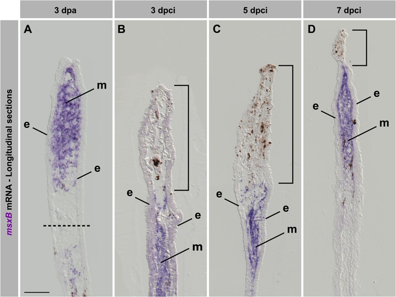The blastemal marker msxB is upregulated in regenerating fins after cryoinjury. (A-D) In situ hybridization of longitudinal fin sections using msxB antisense probe (purple) at 3dpa (A) and different time points after cryoinjury (B-D). Dashed line indicates the amputation plane. Bracket indicates the damaged tissue remaining in the cryoinjured stump. In the amputation model, msxB is upregulated in the mesenchyme of the outgrowth. After cryoinjury, msxB expression is induced below the damaged tissue. At 7dpci (D), a normal blastema is formed, despite small amounts of distally remaining tissue debris. e, epidermis; m, mesenchyme. N=4. Scale bar=100µm.