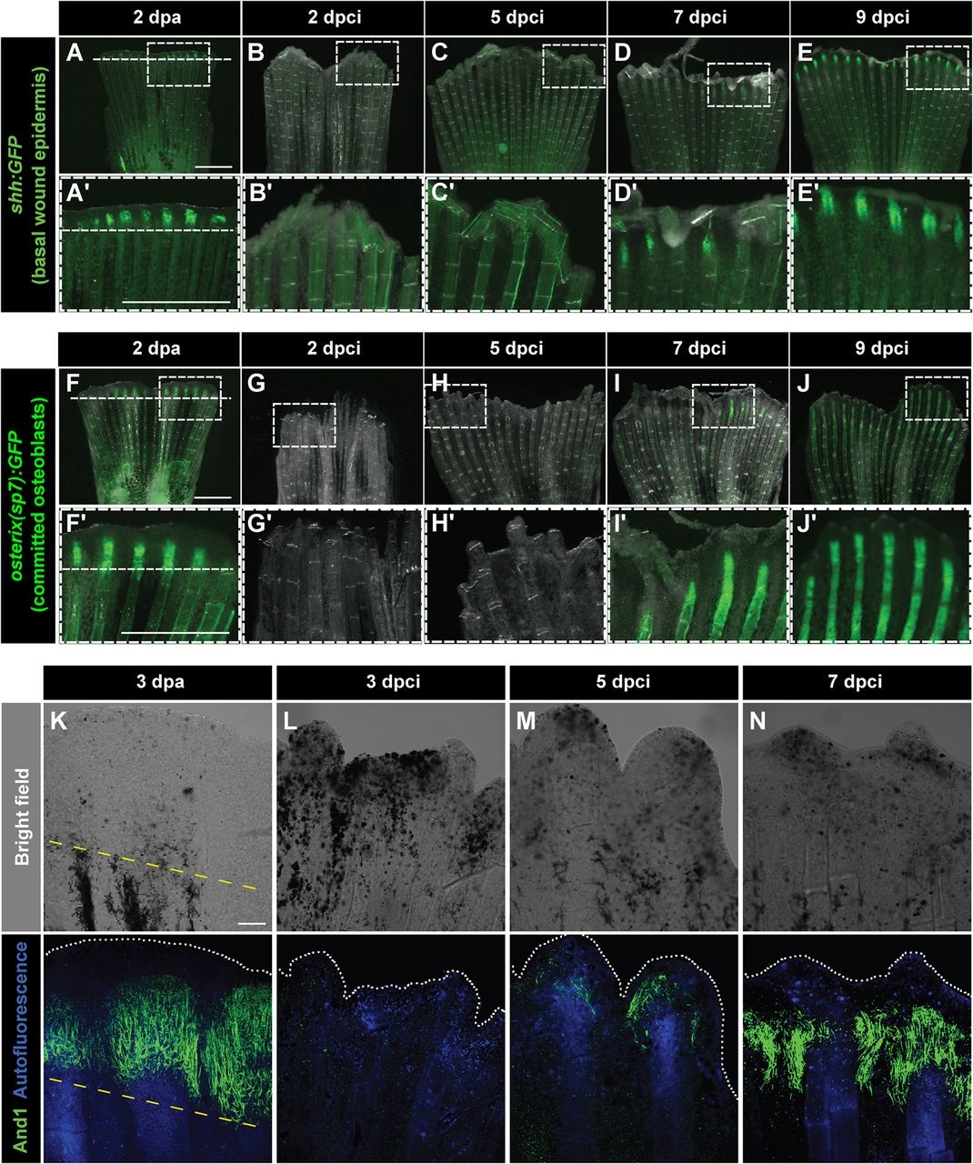 Dynamics of bone and actinotrichia regeneration in cryoinjured fins. (A-E′) Live-imaging of shh:GFP transgenic fish demarcates a subset of cells in the basal layer of the lateral wound epidermis (green) at 2dpa (A) different time points after cryoinjury (B-E). Dashed line indicates the plane of amputation. The expression of shh:GFP becomes detectable starting at 7dpci (D,D′), indicating organization and subdivision of the basal epithelium. N=4. Boxes in A-E magnified in A′-E′. (F-J′) Live-imaging of transgenic fish osterix(sp7):GFP highlights intermediately differentiated osteoblasts (green) at 2dpa (F) and at different time points after cryoinjury (G-J). The expression of osterix(sp7):GFP becomes detectable starting at 7dpci (I,I′), indicating bone regeneration. N=4. Boxes in F-J magnified in F′-J′. (K-N) Bright-field (upper panels) and confocal (lower panels) images of whole-mount fins immunostained with anti-And1 antibodies (green) at 3dpa (K) and at different times after cryoinjury (L-N). Bone matrix is detected by autofluorescence (blue). The bright-field images show dark necrotic tissue at the margin of cryoinjured fins. The expression of And1 starts at 5dpci (M) and becomes more evident at 7dpci (N). N=4. Yellow dashed line indicates the amputation plane. Scale bar in A=1mm and in K=100µm.