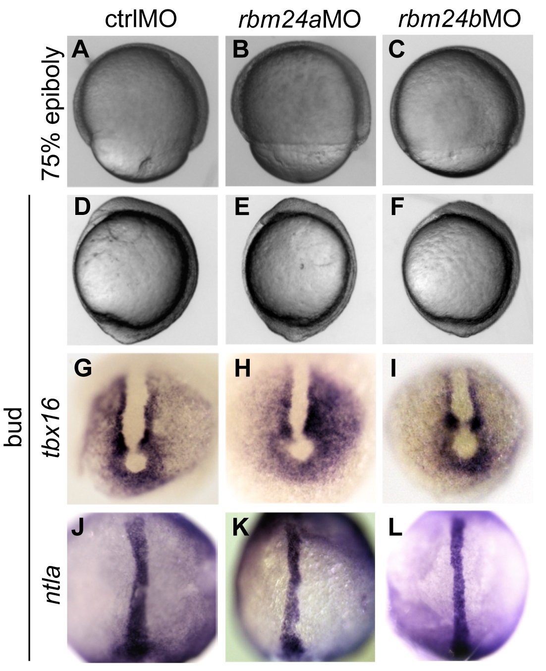 rbm24aMO and rbm24bMO embryos do not display gastrulation defects. ctrlMO, rbm24aMO and rbm24bMO embryos during gastrulation. Bright field imaging of 75% epiboly embryos (A-C). Bright field imaging of bud stage (D-F). ISH of bud stage embryos with tbx16 (G-I) and ntla (J-L) riboprobes.