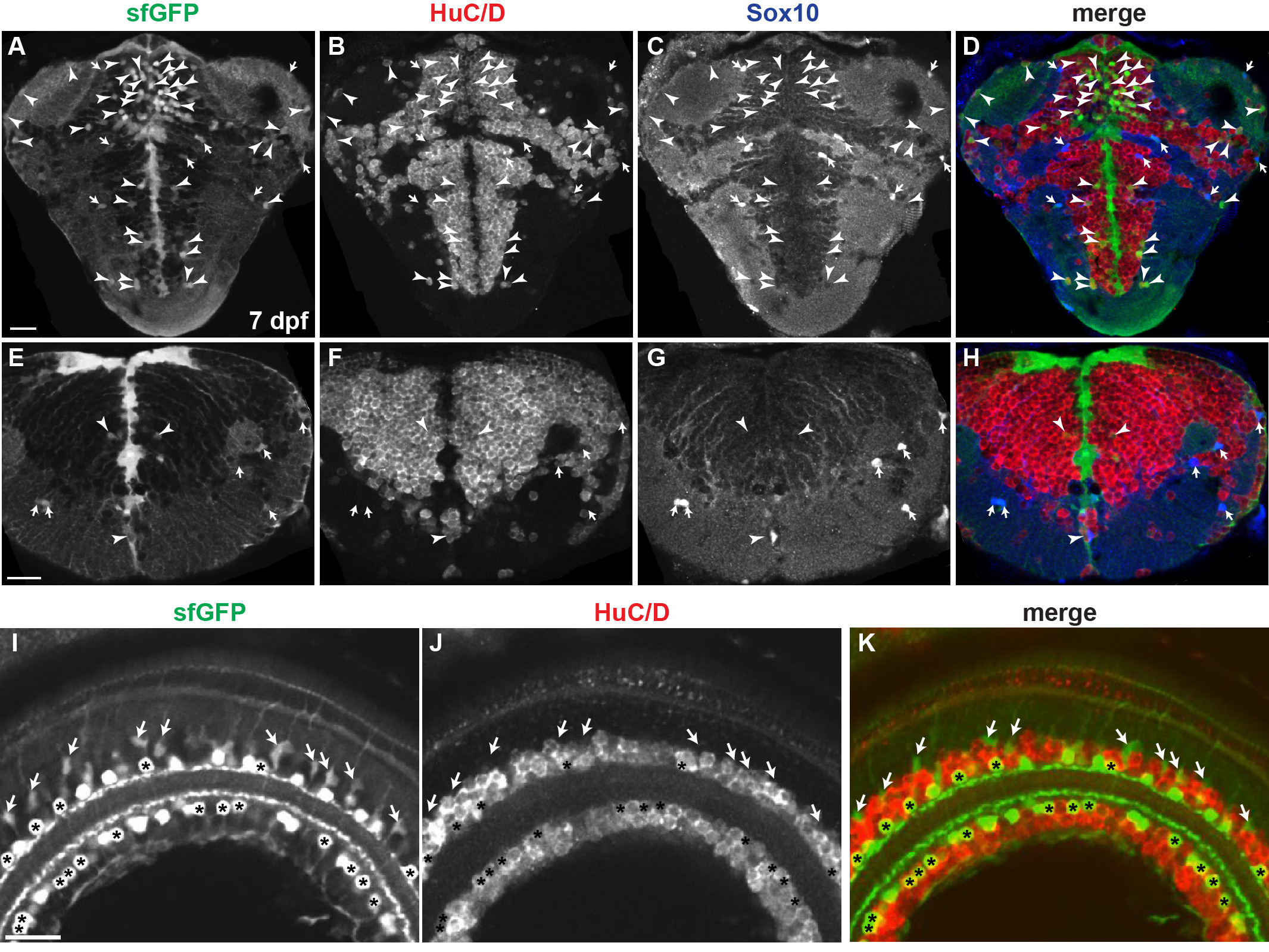 Analysis of sfGFP-positive cells of sox2-2a-sfGFP line. Confocal microscope images. All images are transverse sections of 7 dpf sox2-2a-sfGFP larvae. (A-H) Arrowheads indicate HuC/D-positive, sfGFP-positive neurons. Arrows indicate Sox10-positive, sfGFP-positive OPCs. (A-D) Most sfGFP-positive cells are located in periventricular zones of the telencephalon and diencephalon. (E-H) Most sfGFP-positive cells are located in ventricular zones of the hindbrain. (I-K) Asterisks mark HuC/D-positive, sfGFP-positive cells that are putative amacrine cells. Arrows indicate HuC/D-negative, sfGFP-positive cells that are resembled as Müller glia morphologically.