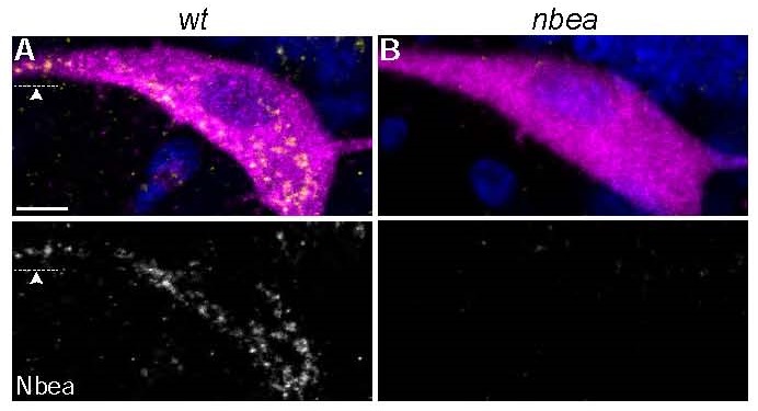 Punctate cytoplasmic Neurobeachin staining is lost in nbea mutants. A,B. Cross section views of M from M/CoLo:GFP transgenic embryos at 5 days post fertilization. Larvae are stained for GFP (magenta), Neurobeachin (Nbea, yellow), and DAPI (blue). Individual Nbea channels are shown in neighboring panels. A. Wildtype Nbea staining appears punctate throughout the cell body and extends out into dendrites (arrowhead). B. Nbea staining is lost in nbea mutants. Images are maximum intensity projections of ~20µm. Ventral is down, lateral is left. Arrowhead points to lateral dendrite. Scale bar = 10 µm.