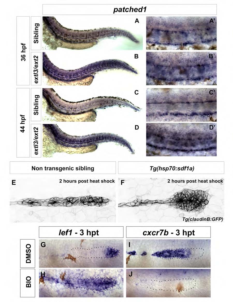(A-D) In situ hybridization of sibling and extl3/ext2 mutant embryos at 36 hpf shows the expression of the Shh target gene patched1 along the trunk (A and B) and magnified views of the notochord in the same fish in A′ and B′. patched1 stays upregulated along the tail trunk of extl3/ext2 mutants at 44 hpf (C and D), especially around the notochord (C′ and D′) where Shh signaling is active. (E-F) Tg(claudinB:GFP) fish were crossed to Tg(hsp70:sdf1a) fish and heat shocked to overexpress cxcl12a. Images were taken after heat shock (~34 hpf). A rounded primordium was observed in transgenic siblings with mild ectopic filopodia formation at the leading edge. (G-J) The Wnt/β-catenin target lef1 is expressed in the leading region of the primordium at 34 hpf (G) but a short 3 hourtreatment with the GSK inhibitor BIO (2 µM) leads to its expansion along the entire primordium (H). The chemokine receptor cxcr7b is expressed in the trailing region of the primordium at 34 hpf (I) and it is inhibited by Wnt/β-catenin signaling after BIO treatment resulting in primordium stalling (J). hpt: Hours post treatment.
