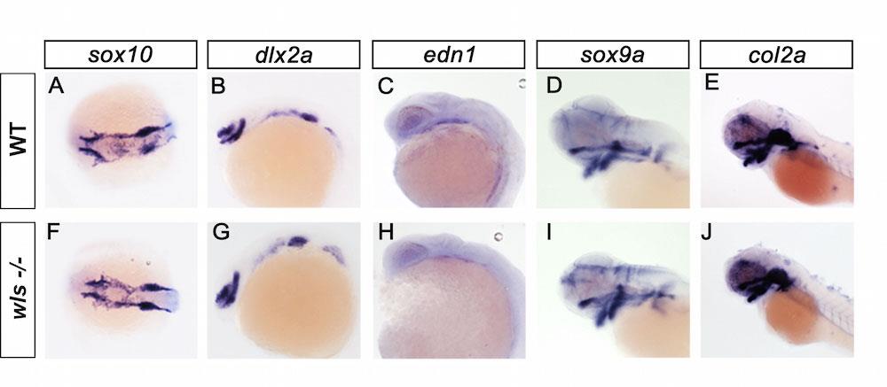 Early neural crest development and patterning are unaffected in wls-/-. Whole mount in situ hybridization of the indicated genes in wild-type and wls-/- embryos with head to the left in dorsal view (A,F) and lateral view (B-E, G-J). At all stages and genes examined, the expression does not differe between wild-type and wls-/- mutants. Markers used: sox10: early cNCC; dlx2a: migrating cNCCs; edn1: cNCC migration; sox9: cartilage formation; col2a: cartilage formation.