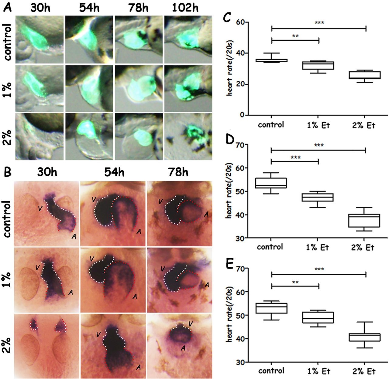 Phenotypic analysis, expression of cmlc2 and heart rate analysis after early exposure of alcohol. (A) Morphological characteristics of the heart in alcohol-exposed larvae. (B) Ventral view of the expression of cmlc2 in the heart of alcohol-treated larvae with the head at the top at 30, 54 and 78hpf. (C-E) Heart-rate analysis in ethanol-treated larvae at 30 hpf (C), 54 hpf (D) and 78 hpf (E). Red dotted line, atrium; white dotted line, ventricle. Error bars represent mean±s.e.m.; **P<0.01, ***P<0.001 by one-way ANOVA; n=48 for each group.
