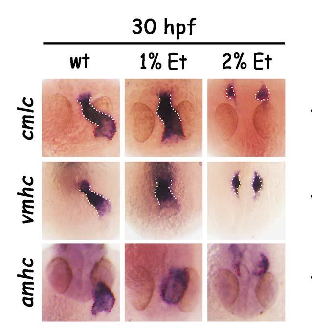 The effect of alcohol exposure on the expressions of amhc, vmhc and cmlc in zebrafish larvae at 30hpf.