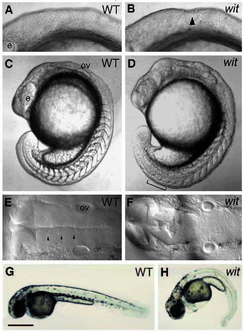 Phenotype of live witta52b embryos. If not specified, all the following figures are rostral to the left, dorsal to the top. Lateral views of wild-type (A) and mutant (B) embryos at 9-somite stage. The indentation in the hindbrain (arrowhead) is indicated. Lateral views of wild-type (C) and mutant (D) embryos at 17-somite stage. The indistinct somite boundaries (bracket) are indicated. Dorsal views of wild-type (E) and mutant (F) embryos at 26 hours postfertilization (hpf). Normal rhombomeric boundaries (arrowheads) are not seen in mutant embryos. Lateral views of wildtype (G) and mutant (H) embryos at 36 hpf. Note that there are no visible pigmented melanophores in the posterior trunk of mutant embryo in H. e, eye; ov, otic vesicle. Bar, 200 µm (A,B,E,F); 335 µm (C,D); 640 µm (G,H).