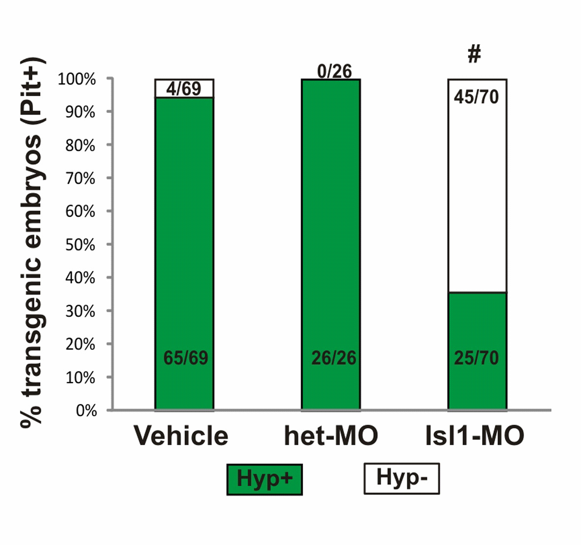 Analysis of EGFP expression in the hypothalamus of nPE1-nPE2zfpomca-EGFP transgenic zebrafish embryos injected with vehicle, het-MO or Isl1-MO. Transgenic embryos at 72 hpf are identified by pituitary EGFP expression (Pit+) and classified as expressing (Hyp+) or not expressing (Hyp-) EGFP in the hypothalamus. Isl1-MO injection significantly lowered the number of transgenic embryos showing hypothalamic EGFP expression. #p<1x10-10 Chi-square analysis.