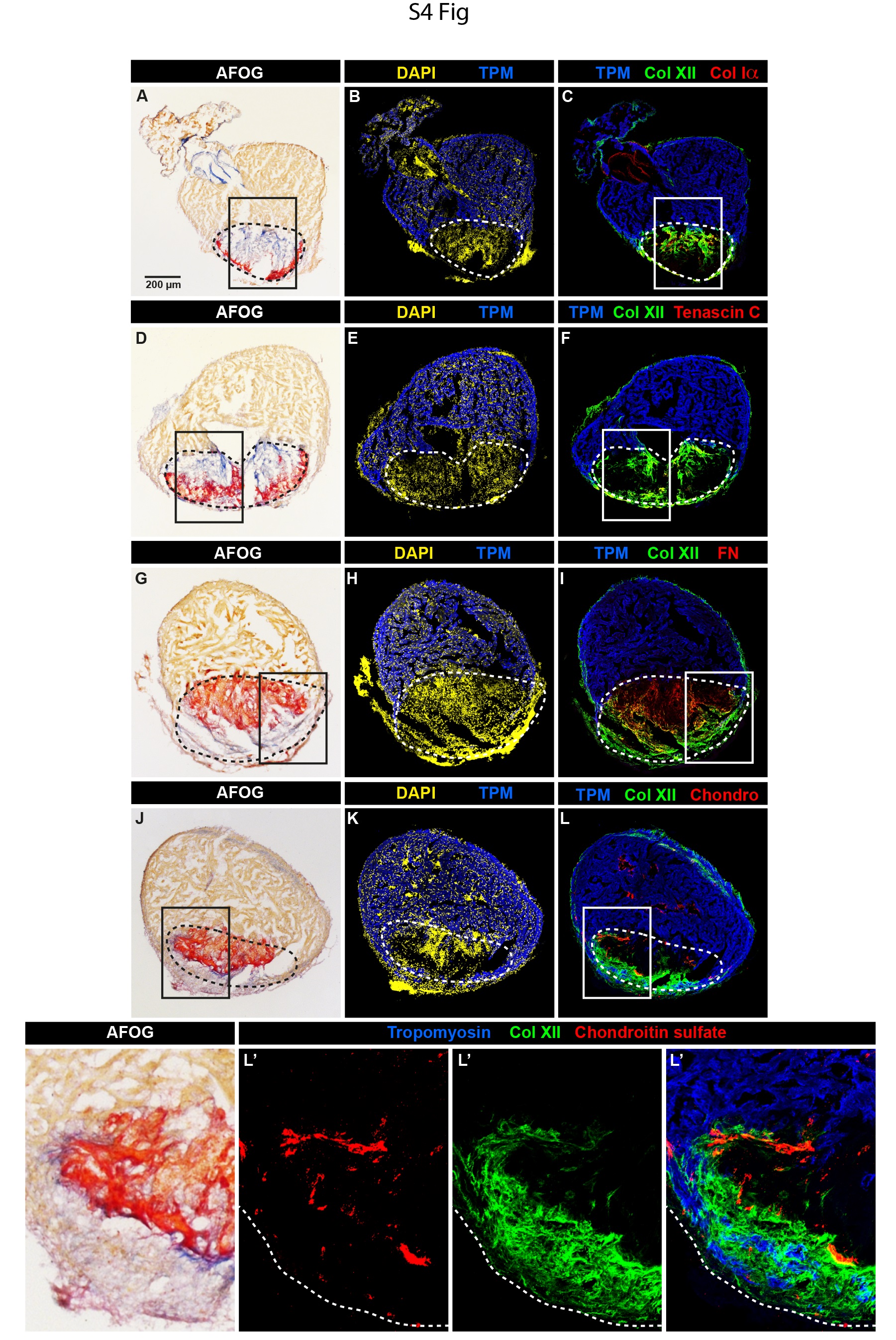 (A-I) The framed areas correspond to the selected regions that are shown at higher magnification in Figure 5. Dashed line encircles the fibrotic tissue. (J-L') Chondroitin sulfate (red) does not markedly co-localize with Col XII (green).