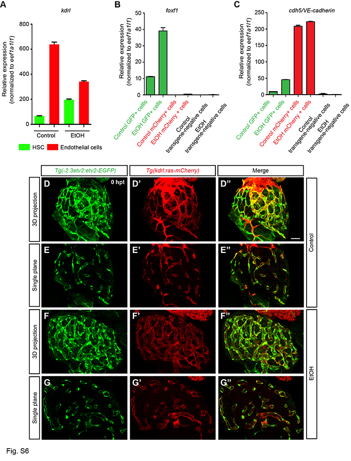 Confirmation of the purity of the FACS-sorted HSC, endothelial cells, and parenchymal cell population. (A) qPCR analyses show that in WT larval livers that were not treated with ethanol, the expression of kdrl was 9.8-fold higher in the FACS-sorted endothelial cells than in the FACS-sorted HSCs at 0 hpt. In the ethanol-treated larvae, the expression of kdrl was 1.7-fold higher in the endothelial cells than in the HSCs. (B) The hepatic stellate cell marker foxf1 (Yin et al., 2012) was only expressed in the Tg(hand2:EGFP)-positive cells in both control and ethanol-treated samples. (C) In both control and ethanol-treated samples, the endothelial cell marker cdh5/VE-cadherin was enriched in Tg(kdrl:ras-mCherry)-positive cells. Its expression was significantly lower in the Tg(hand2:EGFP)-positive cells and absent in the cells that did not express either transgene. (A-C) Triplicates were performed. The results are represented as relative expression levels that are normalized to the house keeping gene eef1a1l1 (mean±s.e.m.). (D-G'') Confocal images showing the comparison of the expression of Tg(-2.3etv2:etv2- EGFP) transgene that marks endothelial cells and their progenitors (D-G) (Schupp et al., 2014) and the expression of Tg(kdrl:ras-mCherry) that marks endothelial cells but not endothelial progenitors (D'-G'). (D''-G'') are the merged images of the two. (D-E'') show control livers at 0 hpt and (F-G'') show ethanol-injured livers at 0 hpt. (D-D'' and F-F'') are confocal three-dimensional projections. (E-E'' and (G-G'') are confocal single plane images. The expression of Tg(-2.3etv2:etv2-EGFP) completely overlapped with the expression of Tg(kdrl:ras-mCherry) in both control and ethanol-treated livers. We did not detect any hepatic cells that were positive for Tg(-2.3etv2:etv2-EGFP) expression but negative for Tg(kdrl:ras-mCherry), which would indicate that they were progenitors. Taking together, it is unlikely that the FACS-sorted HSC population is contaminated by endothelial progenitors that do not express VE-Cadherin. (D-G'') Ventral views, anterior is to the top. Scale bar, 20 μm. 10 larvae were analyzed for each experimental condition.