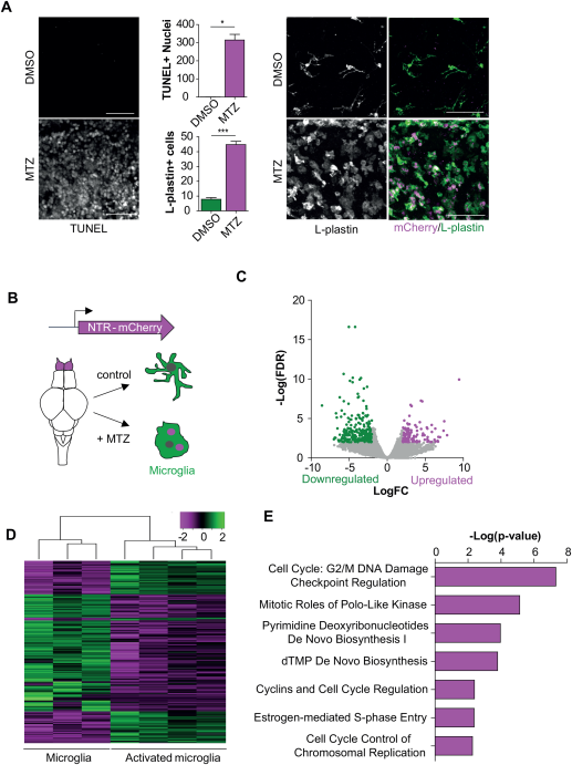 Identification of gene expression changes upon neuronal cell death. (A) TUNEL and L-plastin staining showing increased neuronal cell death upon treatment with MTZ for 48 hours accompanied by microglia activation. mCherry signal represents engulfed neurons. (B) Schematic representation of cells isolated for RNA sequencing on activated microglia. (C) Volcano plot showing differentially expressed genes upon the activation of microglia (FDR <0.01; LogFC > |2|). (D) Heatmap showing Z-score values of all genes differentially expressed between activated microglia and control microglia (367 genes) (FDR <0.01, LogFC > |2|).(E) IPA canonical pathway analysis on significantly upregulated genes in microglia upon NTR-mediated ablation (FDR <0.01;LogFC > |2|). Scale bar = 40 µm in (A). For quantification in (A) cells were counted in 3 selected volumes in the olfactory bulb (4.0 × 10 − 4 mm3) per fish (n = 3). Error bars represent standard deviation, *P < 0.05, ***P < 0.001 (Student's t-test).