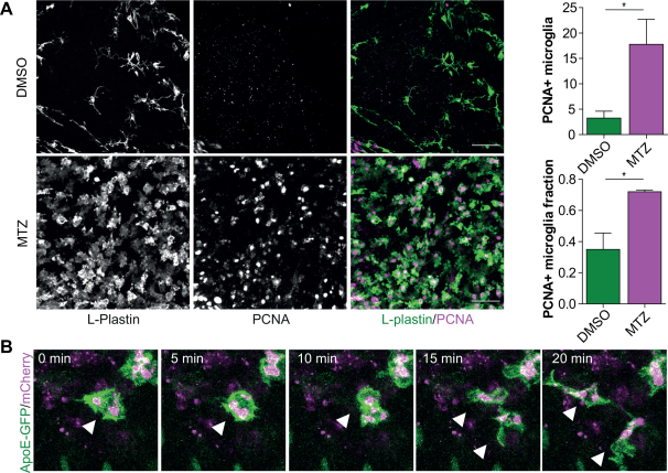 Microglia proliferation upon the induction of neuronal cell death. (A) Immunofluorescence staining in the olfactory bulbs of 3-month-old treated MTZ-treated and DMSO-treated (control) fish. (B) Intravital imaging in 7 dpf zebrafish larvae with Apoe-driven GFP undergoing NTR-mediated neuronal cell death, showing the presence of dividing zebrafish microglia upon neuronal death. n = 3. Scale bar = 40 µm in (A). For quantification in (A) cells were counted in 3 selected volumes in the olfactory bulb (4.0 × 10 − 4 mm3) per fish (n = 3). Error bars represent standard deviation, *P < 0.05 (Student's t-test).
