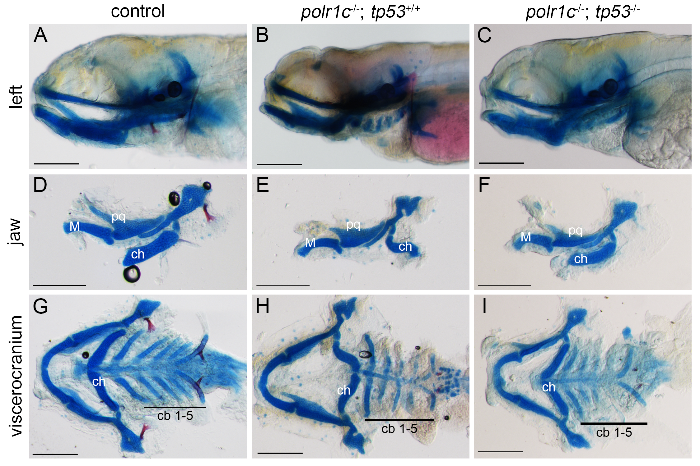 (A-I) Alcian blue and alizarin red staining reveal improved cartilage formation and patterning in polr1c-/-; tp53-/- embryos compared to polr1c-/-; tp53+/+ embryos. Abbreviations: M, Meckel’s cartilage; pq, palatoquadrate; ch, ceratohyal; cb, ceratobranchial. Scale bars = 200 μm