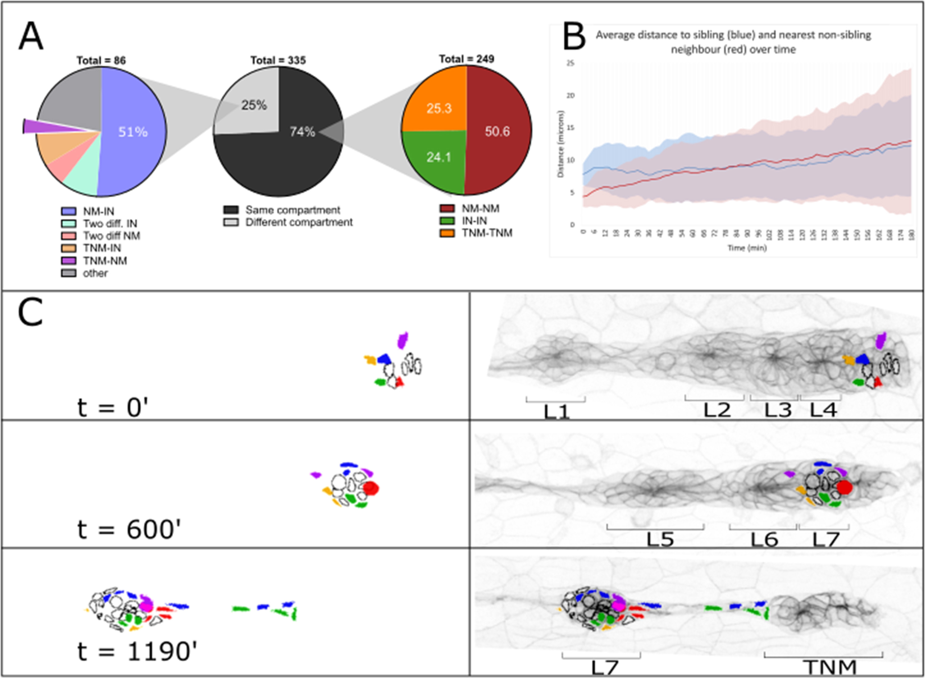 Quantification of cell fate in the PLLp. A Pie charts of cell divisions classified by daughter cell fate. Center panel: Divisions classified by whether both daughters contribute to the same (black) or different (grey) structures in the LL. Right panel: same-fate divisions classified by compartment (NM, IN or TNM). Left panel: different-fate divisions classified by eventual fate of daughter cells. Expanded wedge represents divisions where one daughter cell remains in the terminal cluster and another is deposited in a non-terminal neuromast. “Other” represents divisions in which daughters themselves undergo divisions. B Plot of average separation distance following division over time between sibling cells (blue) and between dividing cell and nearest non-neighbor sibling. Shaded regions represent one standard deviation. C Frames from movie reconstruction showing all cell lineages that will contribute to the L7 neuromast. Black outlined cells represent lineages in which all daughters will contribute exclusively to L7, colored lineages represented three lineages which will contribute to L7 as well as additional compartments (primarily the L7-TNM interneuromast cell population).