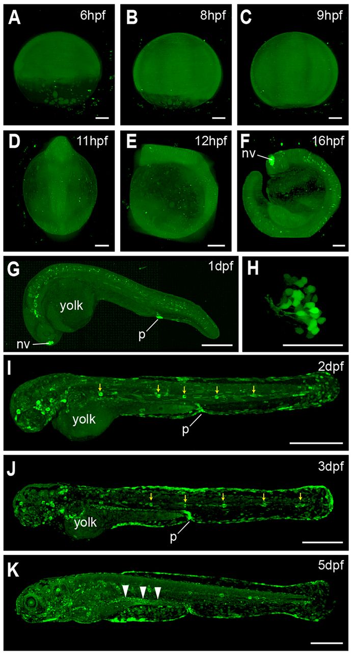 Dynamic NF-κB activity during early zebrafish embryonic development. (A–E) Light-sheet images of Tg(8×Hs.NFκB:GFP,Luciferase) embryos show ubiquitous, weak NF-κB activity from 6 hpf until 12 hpf. (F) The first strong tissue-specific signal was observed in the nasal vesicle (nv) at around 16 hpf. (G–K) Confocal images of Tg(8×Hs.NFκB:GFP,Luciferase) embryos from 1 dpf until 5 dpf. GFP was detected in the proctodeum (p) at 1 dpf (G). The GFP signal in the nasal vesicle (G) originates from microvillous sensory neurons (H). E–G and I–K show embryos in lateral view. Anterior is to the left. H shows the head of embryos from the frontal side. Yellow arrows indicate GFP in the lateral line. White arrowheads indicate GFP in the intestine. Scale bars: 100 µm (A–F); 300 µm (G); 50 µm (H); 500 µm (I–K).