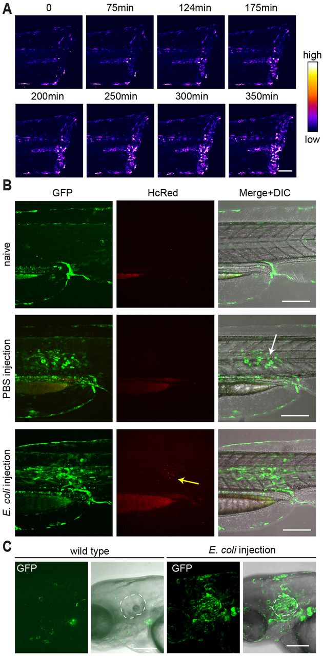 In vivo visualization of NF-κB activity upon local wounding and infection. (A) Time-lapse images derived from Movie 2 show NF-κB activation after tailfin cut. GFP fluorescence in the top panel is shown as a heat map. GFP is upregulated locally near the wound. (B,C) Injection of HcRed-expressing E. coli into the notochord (B) or inner ear (C) of Tg(8×Hs.NFκB:GFP,Luciferase) elicits NF-κB activation 20 h after infection. The bacterial infection results in the accumulation of immune cells in the inner ear. GFP was not expressed in the notochord or inner ear of uninfected control zebrafish. The white dashed line in (C) demarcates the inner ear. Anterior is to the left. Scale bars: 150 µm (A,C); 200 µm (B).