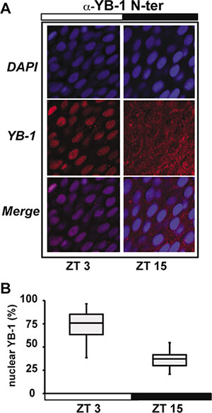 zfYB-1 cellular localization in zebrafish caudal fins. (A) Immunofluorescence analysis of zfYB-1 protein in the caudal fin at ZT3 (light phase) and ZT15 (dark phase) using α-YB-1 N-ter antibody. Panels also show DAPI staining and Merge, which combines both the DAPI and YB-1 signals. White and black bars indicate the corresponding lighting conditions. (B) Quantification of the panel A.