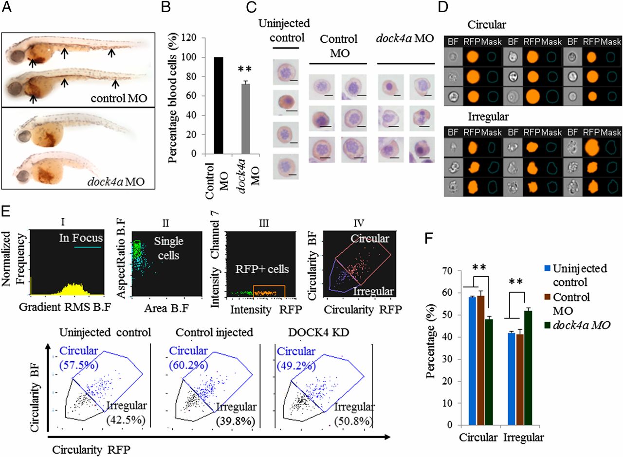 In vivo suppression of dock4a in a zebrafish model leads to dysplastic erythroid cells. (A) Shown are representative embryos following staining at 48 hpf with o-dianisidine to detect hemoglobin (red stain). (Top) Embryos were injected with 5 ng of standard control MO. Arrows indicate blood circulation through the caudal hematopoietic tissue, cardinal vein, and heart, with substantial staining in the sinus venosus on the yolk sac. (Lower) Embryos were injected with 5 ng of the dock4a SB MO, and at 48 hpf, they lack blood circulation and appear relatively pale with less blood in the yolk sac (n = 30 embryos for both panels). (B) Relative percentages of erythroid cells in zebrafish embryos were determined by flow cytometry comparing dock4a knockdown with control samples (with the later set to 100%). Use of gata1:dsred transgenic zebrafish embryos allowed direct assessment of erythroid cells in samples of dissociated whole embryos’ blood (n = 4 independent experiments, minimum of 200 embryos per experiment). (C) Photomicrographs of benzidine- and hematoxylin-positive erythroid cells from cytospins prepared using cells from dissociated zebrafish embryos. (Scale bars, 5 μm.) (D) BF and fluorescence images of RFP-expressing erythroid cells depicting circular- and irregular-shaped morphology harvested from embryos with reduced expression of Dock4a. (E) Quantitation of RFP-positive embryonic zebrafish blood cells that are circular or irregular in shape based on analysis of BF and RFP images using the ImageStreamX instrument. KD, knockdown. (F) Percentages of circular- and irregular-shaped erythroid cells harvested from dissociated zebrafish embryos 48 hpi of dock4a SB MO or control MO or from uninjected embryos (**P < 0.005, Student’s t test).