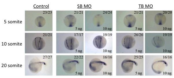 Primitive hematopoiesis initiates normally in the dock4a morphant embryos. Wild-type zebrafish embryos were injected with 0 (control), 5 ng, or 10 ng of the dock4a SB morpholino. The embryos were harvested and fixed in 4% PFA at the 5, 10, or 20 somite stage. Gata1 transcript patterns were detected using an antisense digoxygenin labeled RNA probe, seen initially as two stripes in the lateral mesoderm, converging at the intermediate cell mass in the tail.