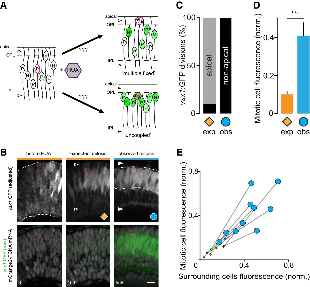 E. The fluorescence intensity of HUA‐treated vsx1:GFP progenitors at the time when they were expected to undergo mitosis (diamonds), and when they were observed to undergo mitosis (circles), plotted against the intensity of the surrounding cells (10 progenitors, four fish). One cell (cyan diamond) was expected to divide non‐apically. Green line indicates the fluorescence change of the lowest expressing progenitor for clarity.