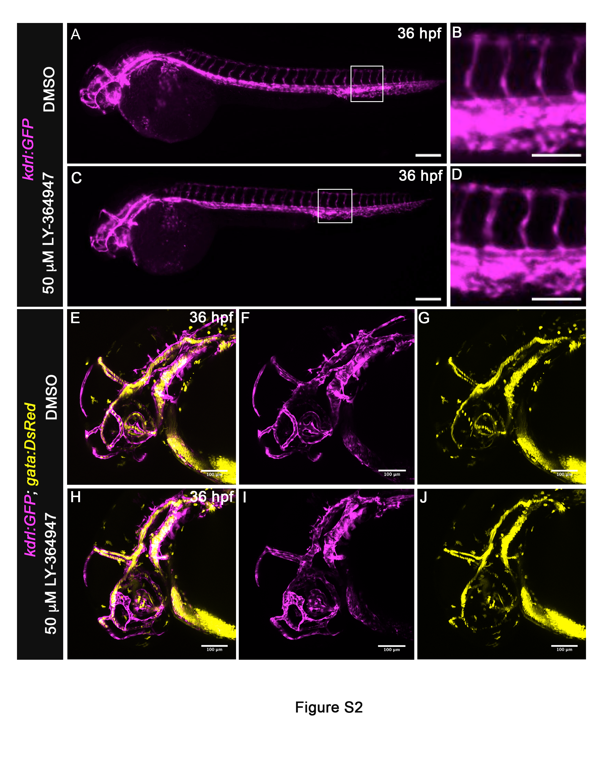 (A-D) Lateral views of 36 hpf Tg(kdrl:GFP) embryos treated from 20 hpf with DMSO (A,B) or 50μM LY-364947 (C,D) imaged in the green channel on a compound microscope to visualize endothelium (pseudocolored magenta). The body vasculature appeared similar between LY-364947-treated and DMSOtreated embryos. Magnified views (B,D) of boxed regions (A,C) highlight intersomitic vessels. (E-J) Left lateral views of 36 hpf Tg(kdrl:GFP), Tg(gata1:DsRed) embryos treated from 20 hpf with DMSO (E-G) or 50μM LY-364947 (H-J) imaged on a confocal microscrope in the green and red channels to visualize endothelium (pseudocolored magenta) and red blood cells (RBC) (pseudocolored yellow), respectively. Merged (E,H) and single channel (F,G,I,J) images are shown. In both cohorts, cranial vascular development and integrity appeared grossly normal and supported RBC circulation. (A,C) Scale bars = 200μm, (B,D-J) Scale bars = 100μm. (n=4 to 5 embryos per group)