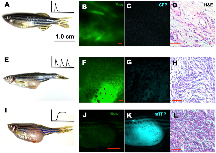 Tumor induced by periodic or constitutive, but not transient activation of kRASG12V expression. In the latter system, one-time activation of kRASG12V expression was induced by transient cyclofen incubation or photo-activation of caged cyclofen at 1dpf (A). Periodic kRASG12V expression was achieved by 1 day incubation in 2 μM cyclofen every 5 days for a course of two months (E). (B–D) Transient induction of kRASG12V did not affect normal development (as shown by the histopathological staining) with no CFP expression in one-year old fish. (E–H) Tumors were observed (albeit rarely) in fish periodically treated with cyclofen. A representative one-year old fish displayed a clear tumor (E) revealed by histopathological staining (H). Interestingly, the cells in the tumor still expressed EosFP (F), but lost CFP expression (G). (I–L) Constitutive kRASG12V expression following light-activation of caged cyclofen induced tumor (I) in 5 month-old fish as revealed by both fluorescent markers (J,K) and H&E staining (L). Scale bar: B, D, F, H, L 200 μm; J, 1 cm.