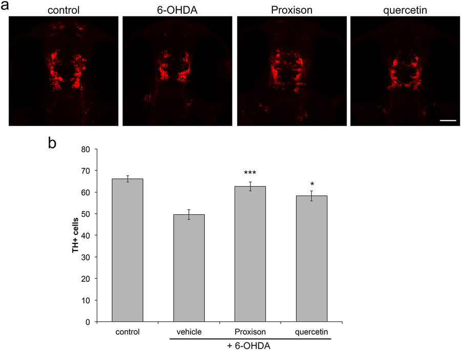 Antioxidant protection against 6-OHDA-induced dopaminergic cell death in zebrafish embryos. (a) Zebrafish embryos at 24 hours post-fertilisation (hpf) were treated with 6-OHDA for 24 hours in the presence or absence of the antioxidants Proxison or quercetin (10 μM). Embryos were then fixed at 48 hpf, immunostained for TH (red) and confocal images were taken of the embryo head viewed from the top. Scale bar: 50 μm. (b) The number of TH-positive cells in each embryo was counted for each treatment group (control, n = 28; vehicle, n = 30; Proxison, n = 26, quercetin, n = 24). Bars represent the mean number of TH-positive cells and error bars show the SEM. ANOVA with Tukey’s post-hoc test was performed to assess the significant difference to the 6-OHDA treated embryos; *p < 0.05, ***p < 0.001.